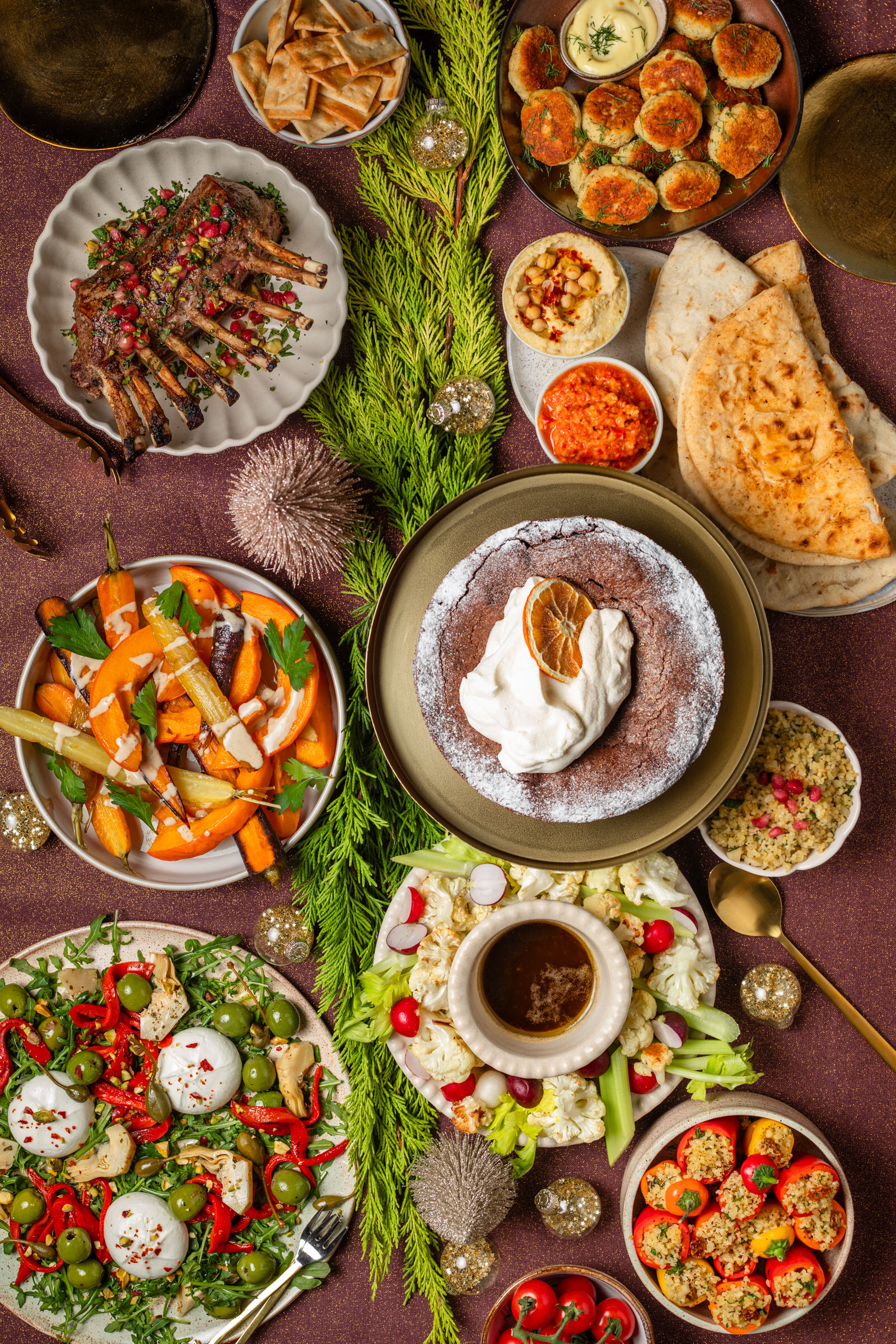 Laat ik daar nou meer dan genoeg inspiratie voor hebben in deze fase van mijn leven en daarom barst dit Mediterraanse kerstmenu uit elkaar van de lekkere gerechten! Van een antipasti schotel, bagna cauda ansjovisdip met rauwkost, naan met dipjes tot lamsrack met pistache en granaatappel, geroosterde groenten met tahinsaus en een torta caprese met sinaasappel toe.