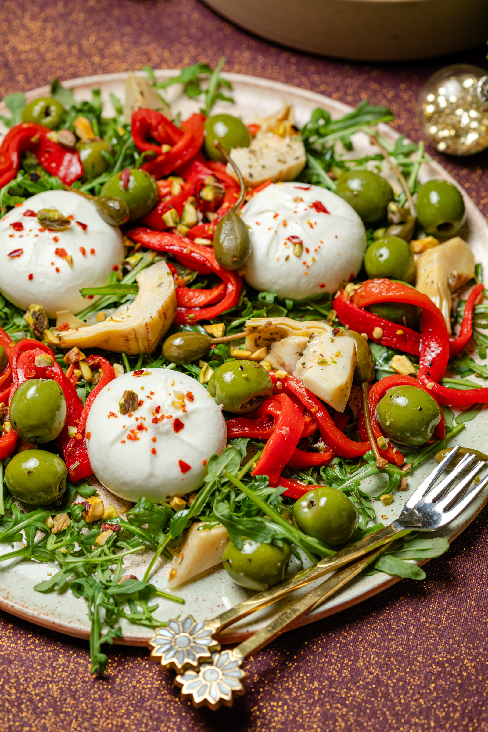 - Verdeel de bolletjes burrata over de rucola en verdeel de geroosterde paprika, kapperappeltjes, olijven en artisjokharten rondom.