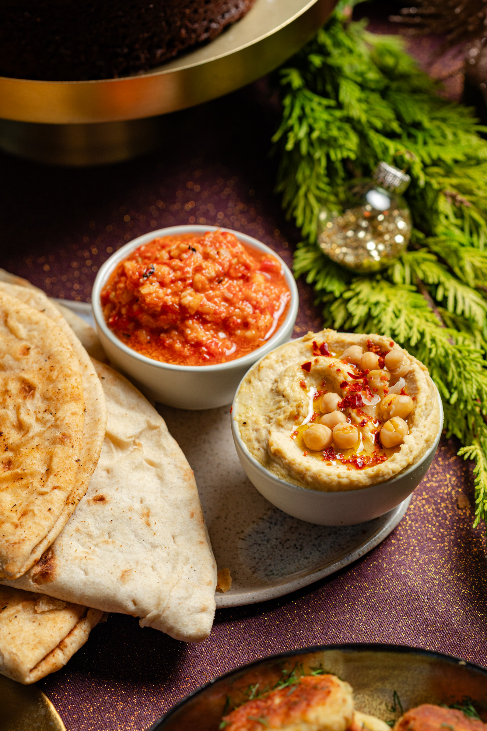 Warme flatbreads met geroosterde paprikadip en hummus