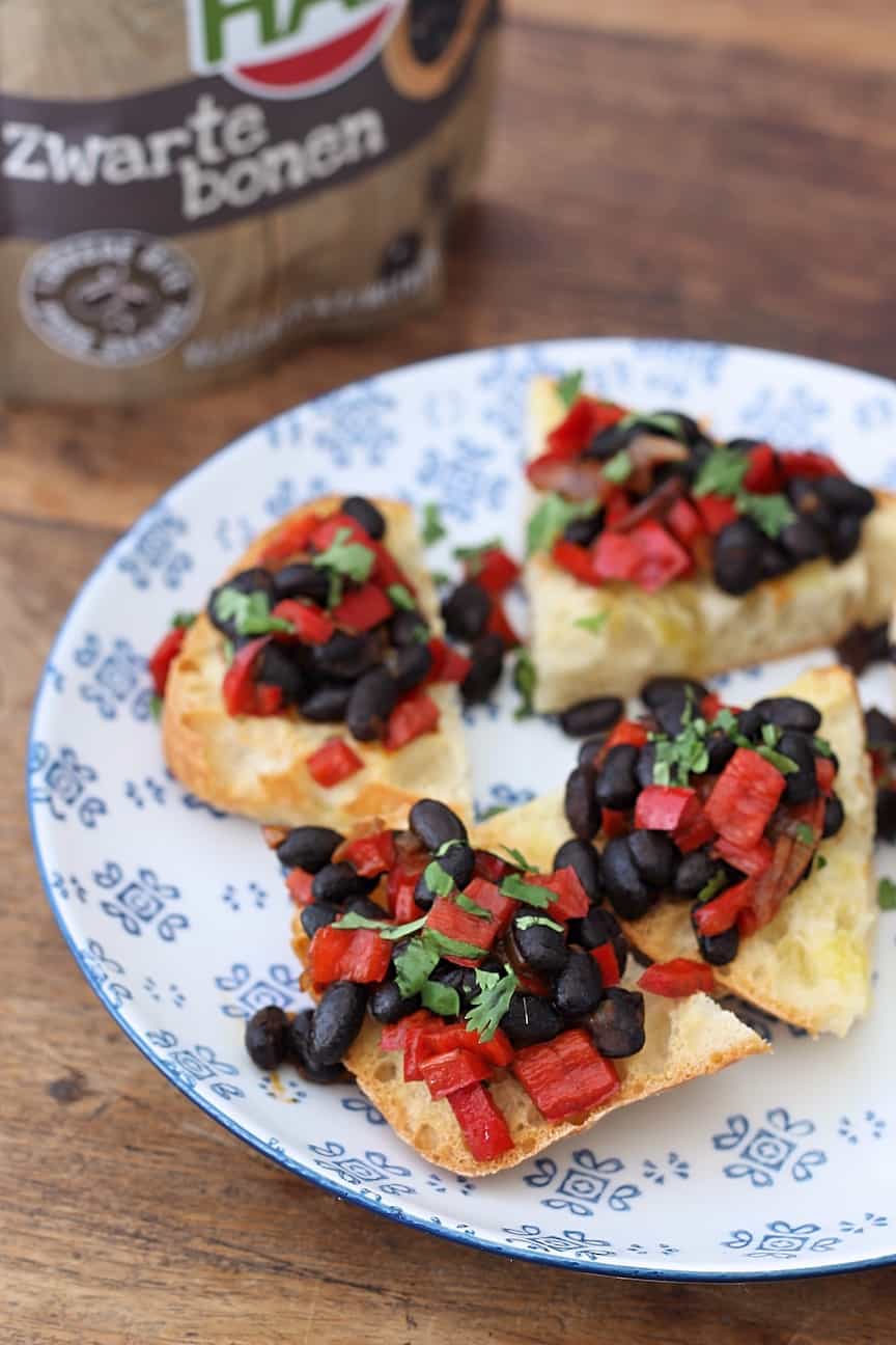 Of maak deze bruschetta’s met ‘gerookte’ zwarte bonen, paprika en koriander: fruit een ½ gesnipperd sjalot in zonnebloemolie. Voeg 1 zoete puntpaprika in kleine stukjes toe en bak kort mee samen met ½ tl gerookt paprikapoeder. Voeg 100 gr zwarte bonen toe en bak kort mee. Rooster in de tussentijd ciabattabrood (doormidden gesneden) met wat olijfolie en snijd daarna in stukjes. Beleg je bruschetta’s met de zwarte bonen, garneer met fijngehakte koriander en serveer.