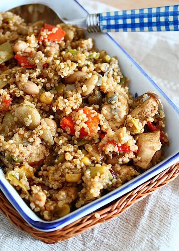 Pak een grote pan of wok en verhit deze. Schenk er 2 eetlepels olijfolie in en fruit de ui en knoflook samen met een volle eetlepel Mexicaanse kruiden . Daarna komen de stukjes kip erbij en deze bak je rondom bruin aan. De groenten kunnen er nu bij en die wok je nog een paar minuten totdat alles gaar is. Schep nu de bonen en quinoa erdoor, warm nog even door en serveer.