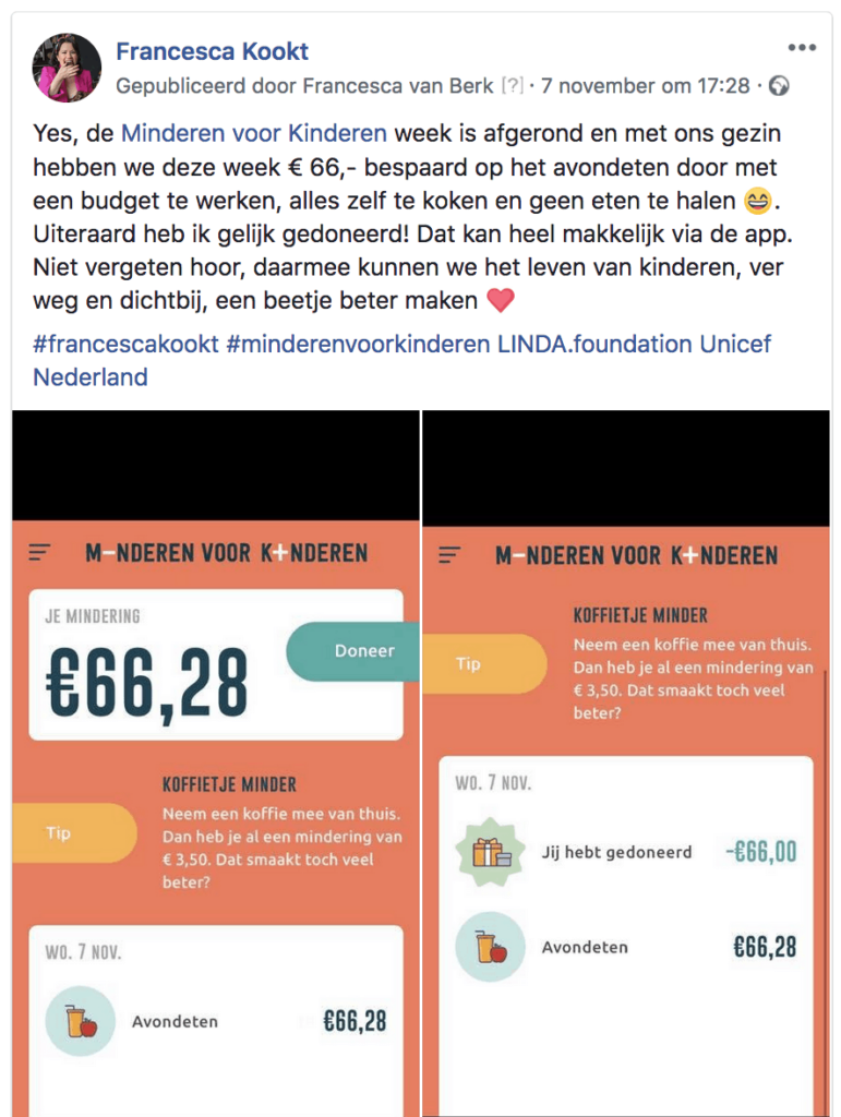 Iedere dag staat er bij ons een lekkere maaltijd op tafel. Of het nou zelfgemaakt of -gekocht is, onze kinderen kunnen iedere dag smullen. Minderen is daarbij nooit een noodzaak geweest, maar ik realiseer me, sinds ik moeder ben des te meer, dat dat zeker niet bij iedereen het geval is. Om die reden steun ik de belangrijke oproep van Minderen voor Kinderen en ben ik een van hun ambassadeurs geworden. Met een beetje minder in maar één week kunnen we heel veel kinderen meer geven! Tijdens de Minderen voor Kinderen-week ga ik jullie inspireren met heerlijke budgetrecepten waarmee je met gemak geld kunt besparen. Deze week gaan we ook geen eten bestellen of halen, ook daarmee bespaar je veel! En die besparing doneer ik uiteindelijk aan Minderen voor Kinderen. Doe je met me mee? Het is maar een kleine moeite en is voor een ander heel wat waard.