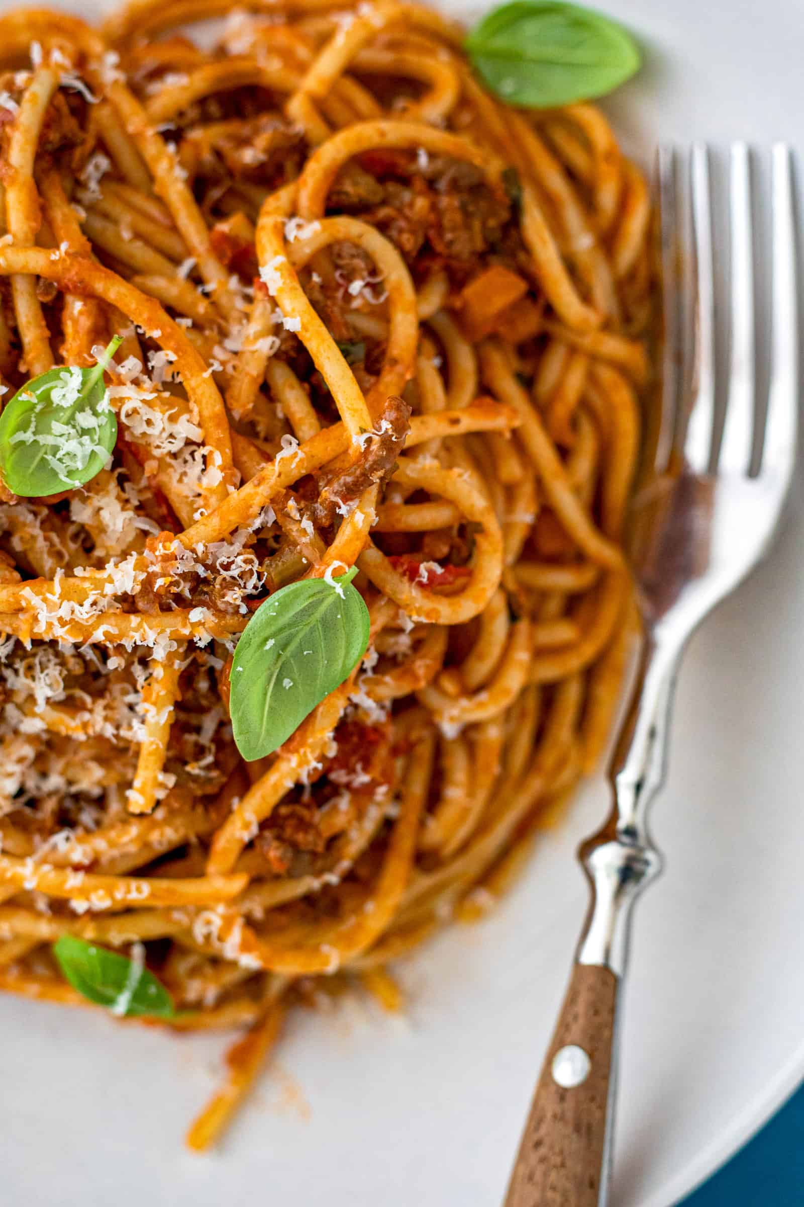 Ga voor de lol eens ‘spaghetti bolognese’ googelen en kijk wat voor foto’s je tegenkomt. Voornamelijk veel mooi opgemaakte bordjes met rode, goedgevulde tomatensauzen waar je direct trek van krijgt. Maar helaas, dat is geen bolognese. De traditionele bolognesesaus (die, jawel, uit Bologna komt) is namelijk echt een vleessaus. Waar zeker wel een hint van tomaat in zit en ook gevuld is met onder andere ui en bleekselderij, maar het is niet de rode pastasaus zoals we ‘m allemaal weleens gegeten hebben. Die ook heel lekker is trouwens! Mijn kinderen zijn er dol op, maar dit is de ‘vernederlandste’ versie.