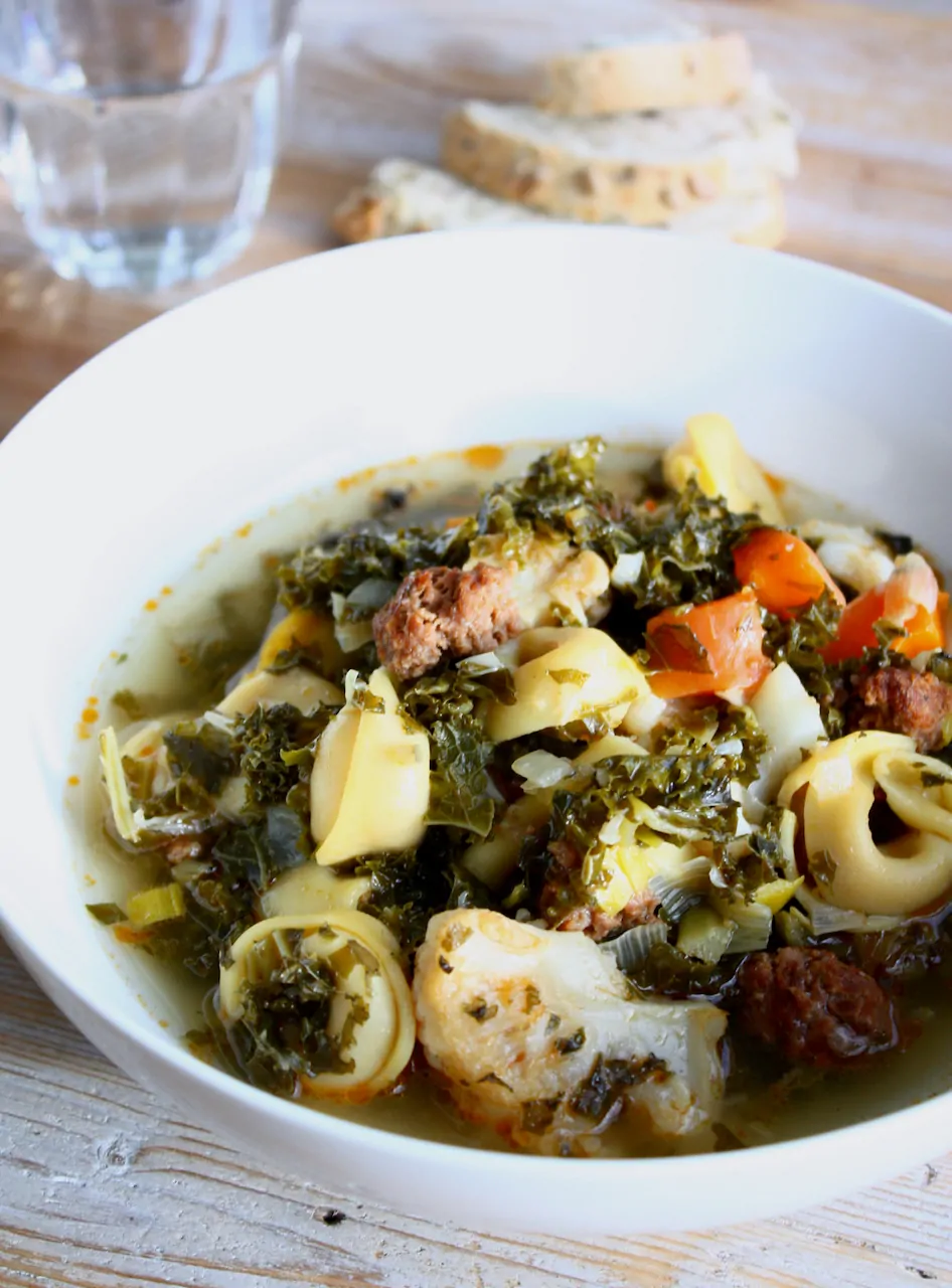 Een minestrone is voor mij een ideaal gerecht om restjes in te verwerken. Groente, pasta en vlees, alles gaat erin. Met als resultaat een goedgevulde soep waar het hele gezin van kan eten. Lekker om in te dopen met een stuk brood en een perfect gerecht voor doordeweeks. Ik besloot eens te varieren en maakte een minestrone bomvol boerenkool en andere groenten.