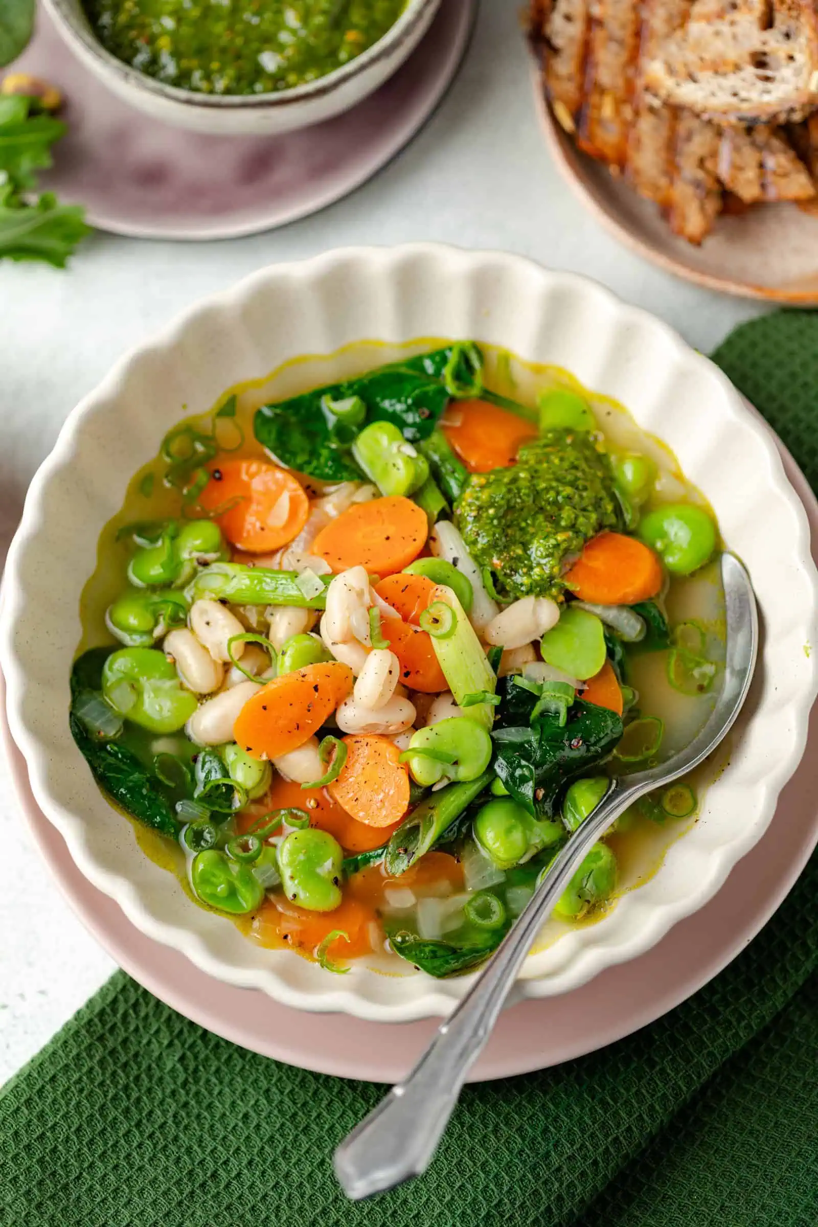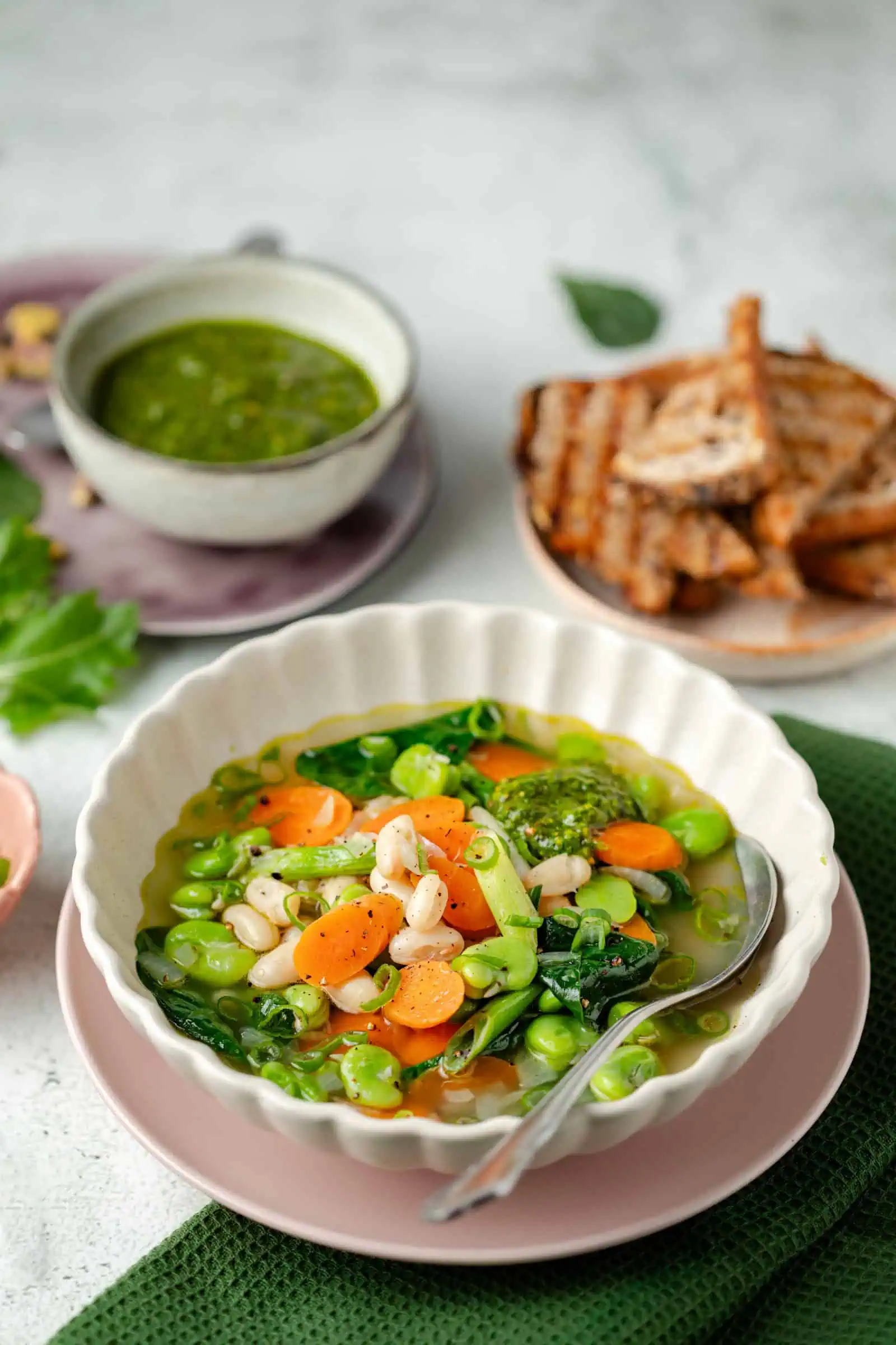 - Serveer de minestrone in kommen en garneer iedere kom soep optioneel met een lepel pesto en serveer er geroosterd (zuurdesem)brood bij.
