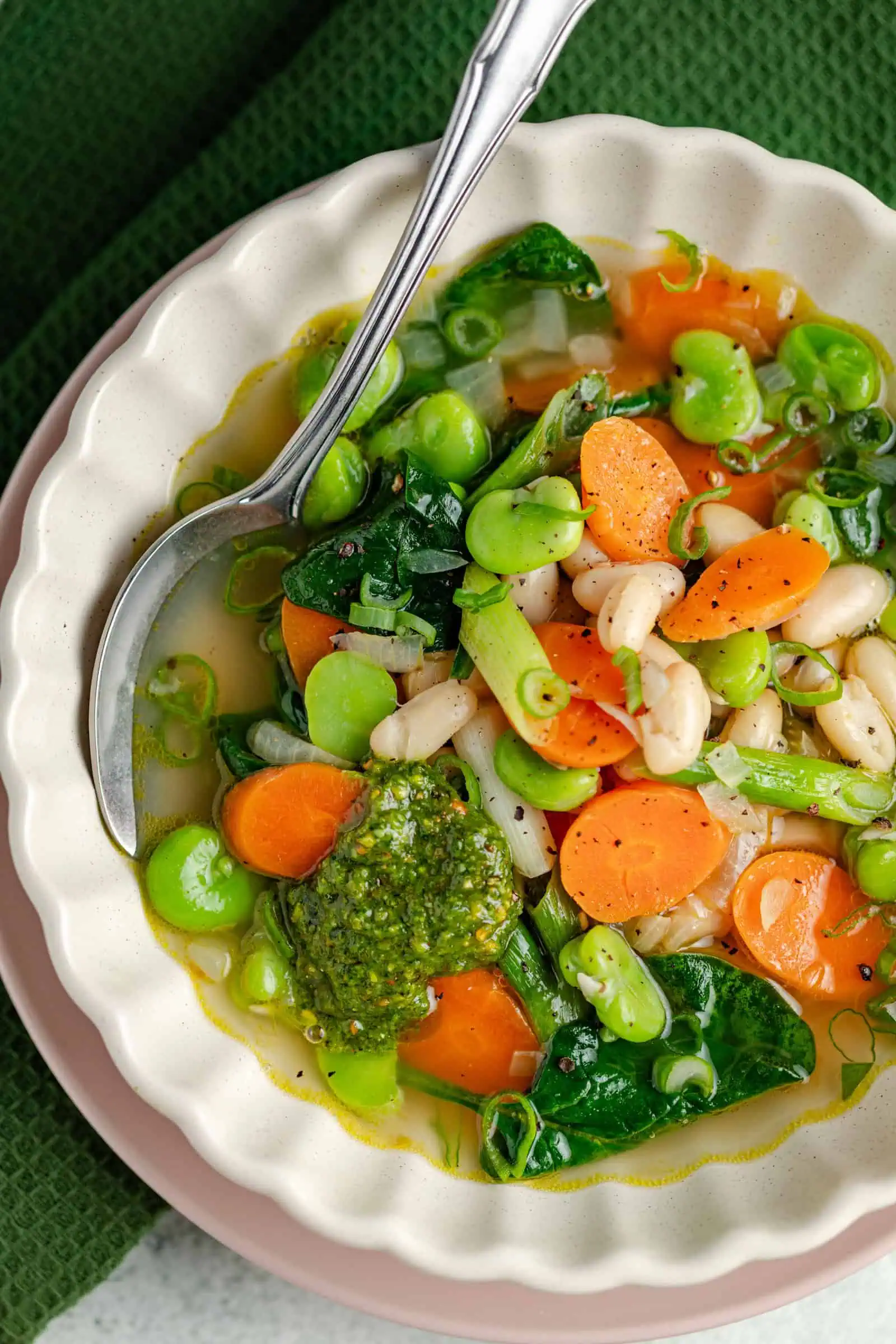 Deze minestrone met tuinbonen is heel makkelijk te maken, alleen dat doppen hè. Ja, dat is wel een karweitje, maar is het ontzettend waard. Mocht je nou niet de tijd of de zin hebben, in het recept heb ik ook een shortcut opgenomen ;-).
