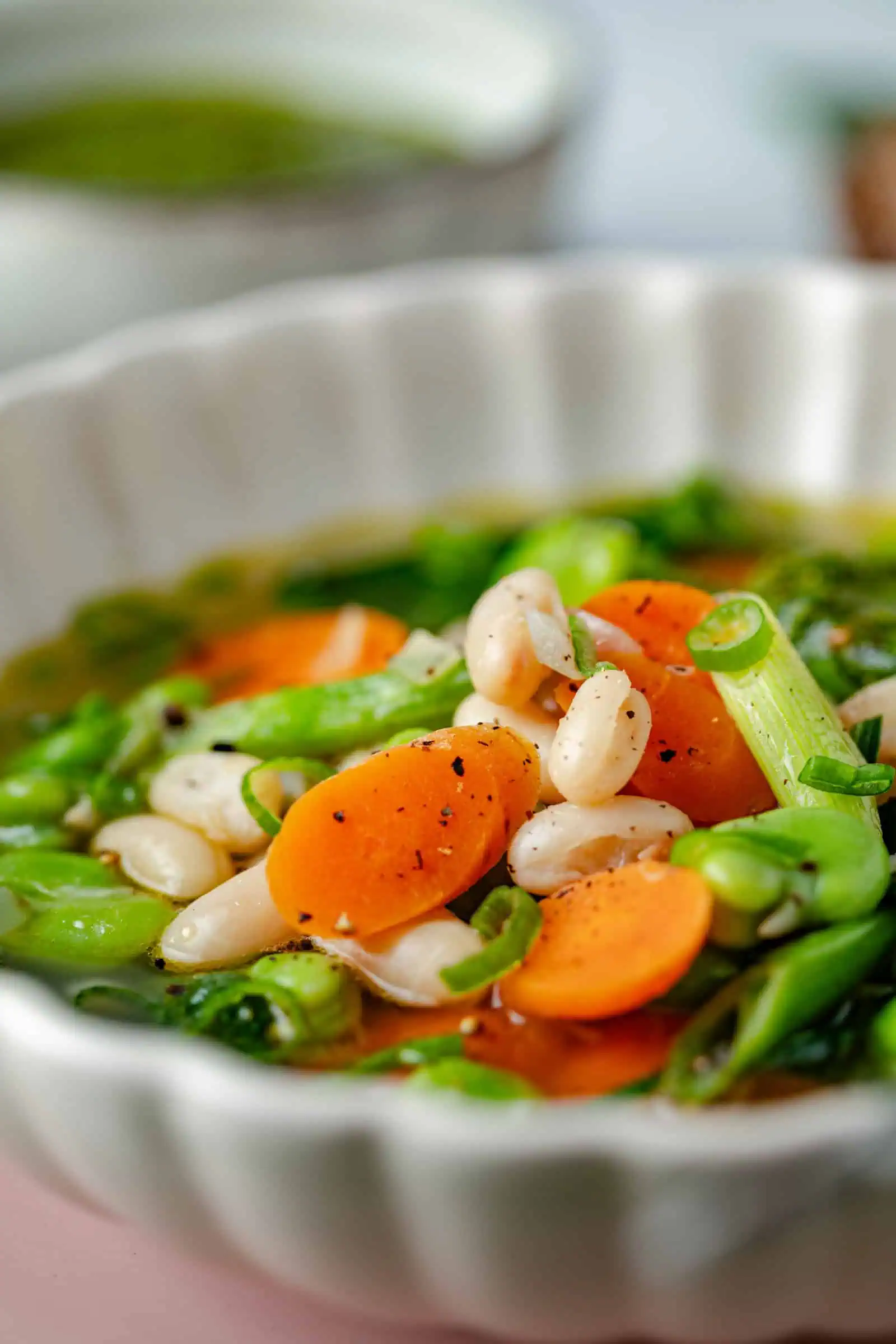 Wanneer er weer tuinbonen in het seizoen zijn, begin ik heel snel te doppen. Dubbel doppen om precies te zijn, want als ook het stugge vliesje van de tuinboon is verwijderd, smaakt deze het allerlekkerst. Met de allereerste oogst die ik in huis haalde, maakte ik onlangs deze minestrone met tuinbonen, citroen en lente-ui. Het werd een heerlijk frisse bouillon vol groenten en peulvruchten. Een ideale maaltijdsoep voor lente- en zomerdagen.