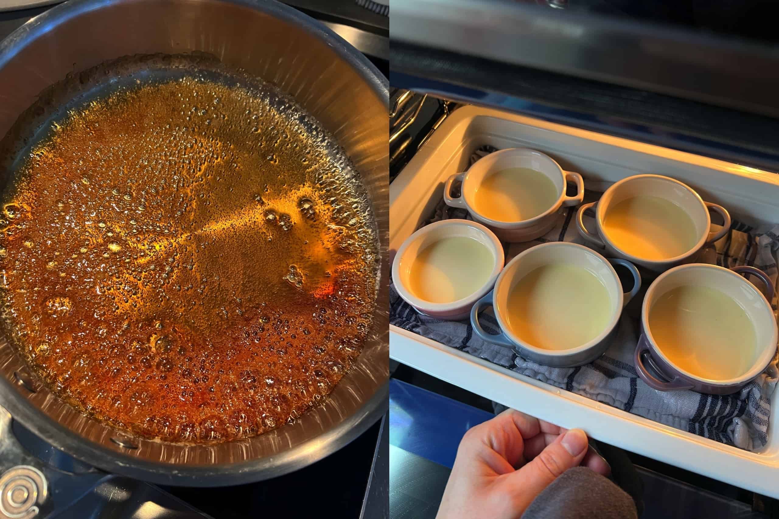 - Strooi de 200 gram kristalsuiker gelijkmatig in een pan met dikke bodem en voeg de 2 el water toe. Plaats de pan op middelhoog vuur en laat de suiker smelten, roer niet terwijl dit gebeurt. Laat de karamel nu pruttelen (zet eventueel het vuur iets hoger als je geen bubbeltjes ziet) tot deze goudbruin van kleur wordt. Roer nog steeds niet (dat is essentieel), maar draai de pan wel af en toe even rustig rond zodat de karamel kan mengen. Als de karamel goudbruin is, mooi glanst en heerlijk ruikt, schenk je deze rustig en gelijkmatig op de bodem van de ronde ovenschaaltjes. Het is niet erg als de karamel gelijk hard wordt.