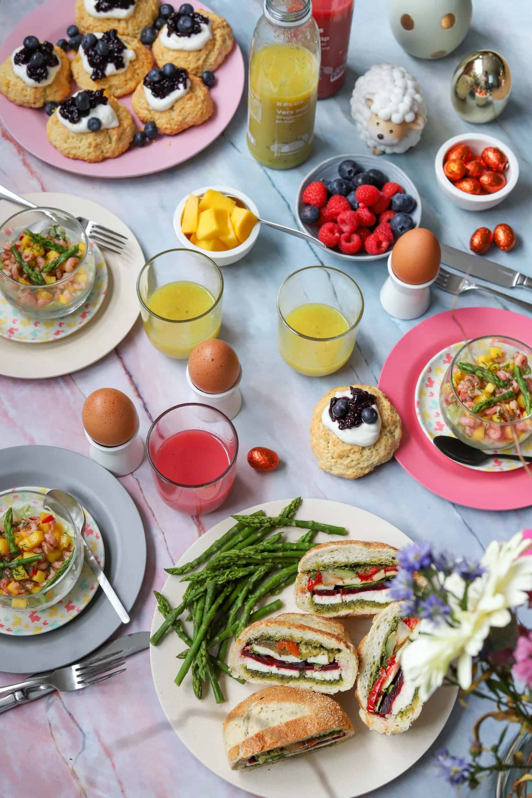 Voor de mini paasbrunch maakte ik gevulde Italiaanse bollen met pesto, geroosterde groenten, mozzarella en biet. Maar ook een glaasje met een frisse garnalencocktail met mango en groene asperges. En als zoet gerechtje zelfgemaakte scones met blauwe bessencompote en citroen. Scones zijn heel makkelijk om zelf te maken en kunnen met mijn recept niet mislukken. Zelfs de kinderen kunnen ze maken.