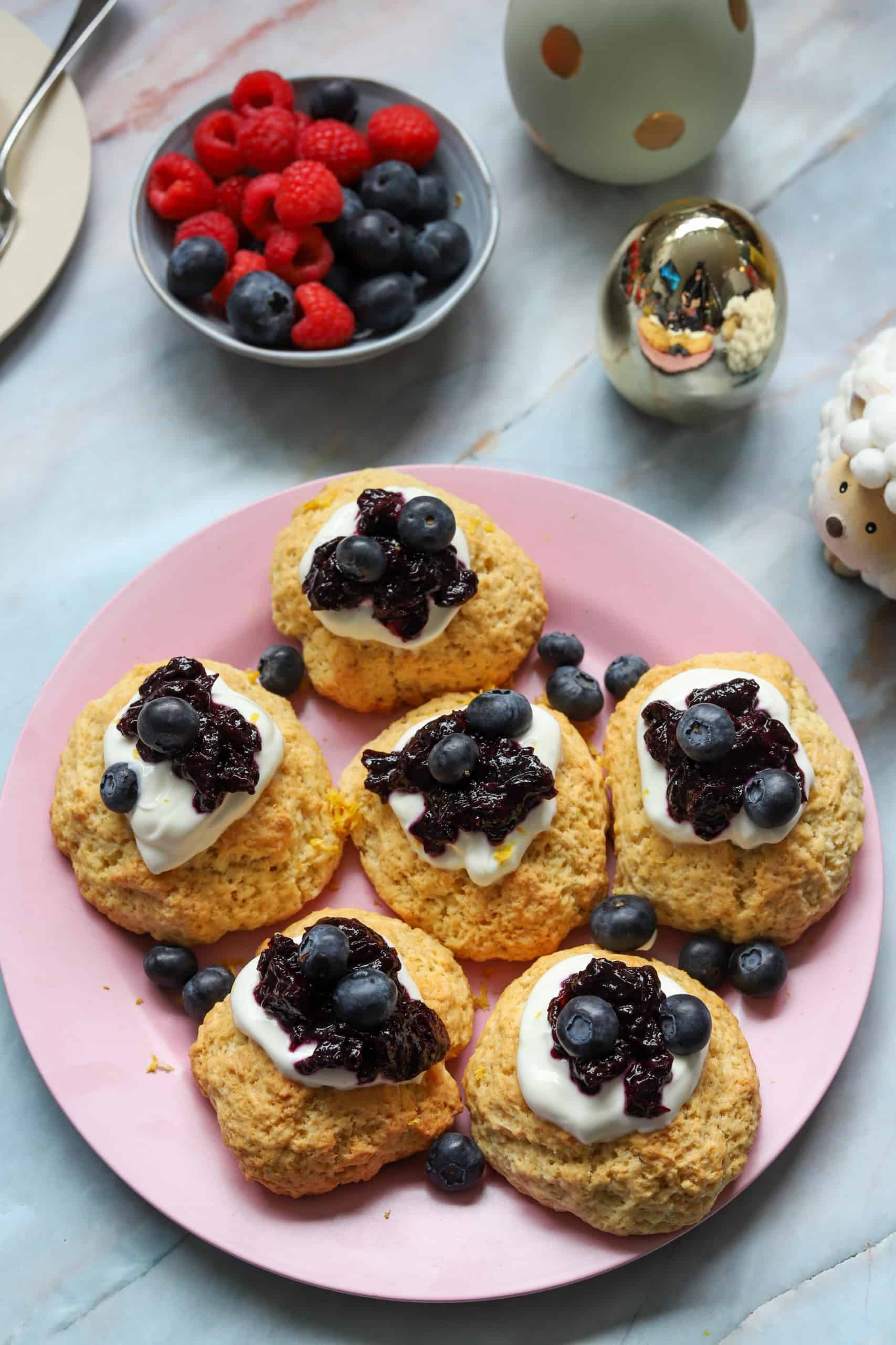 - Leg de scones op een mooie schaal en garneer iedere scone met een lepeltje Griekse yoghurt. Garneer met wat blauwe bessencompote, geraspte citroenschil en verse blauwe bessen. Serveer daarna direct.