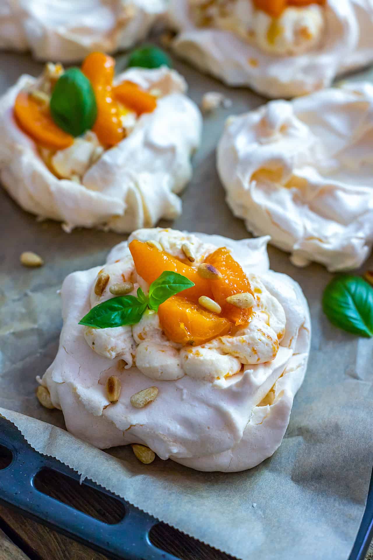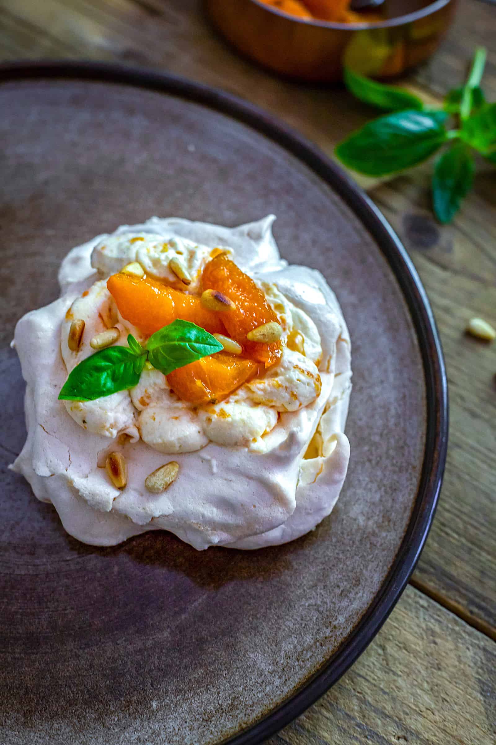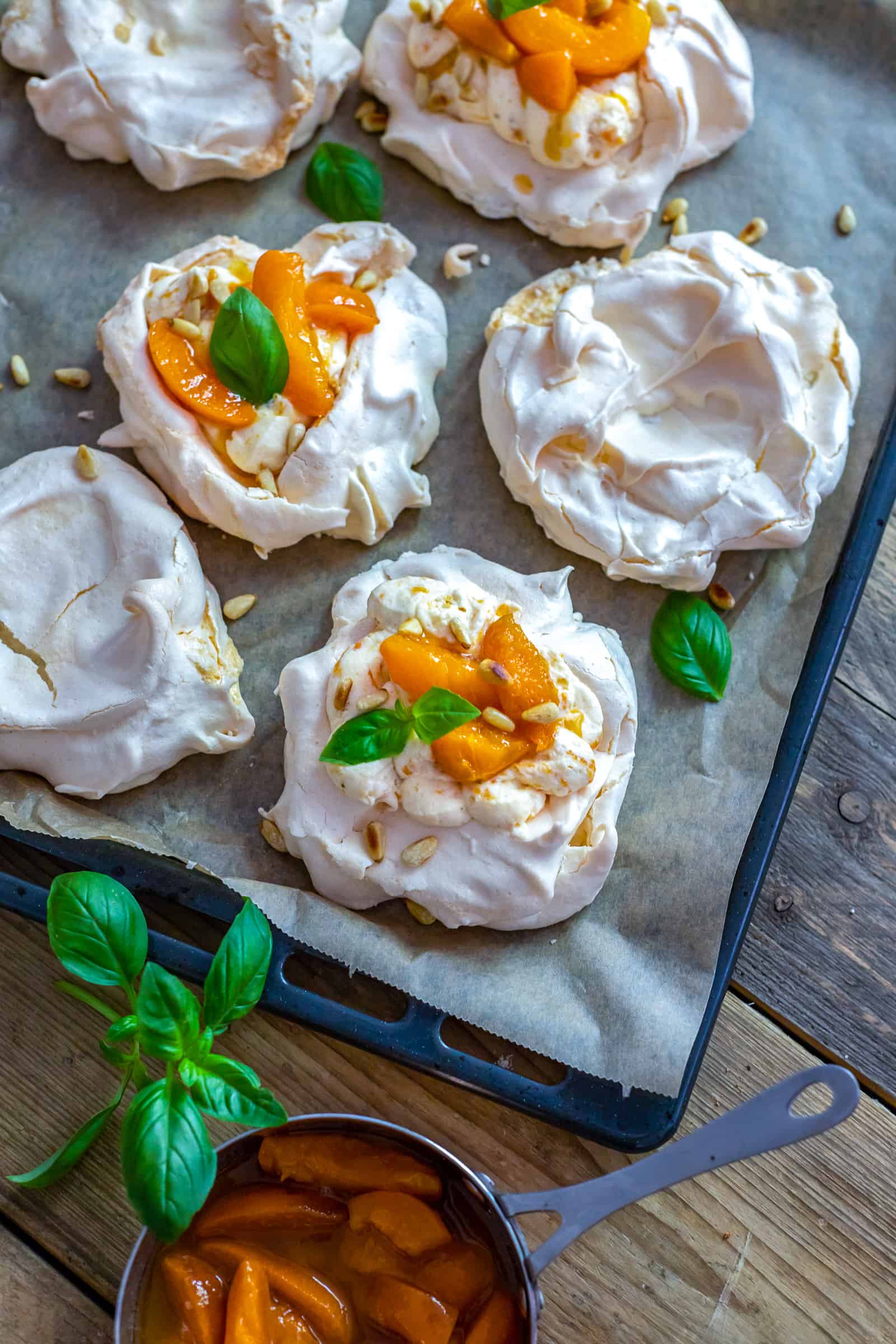 - Spuit vlak voor serveren wat van het slagroommengsel op de mini pavlova’s en schep er dan wat gekaramelliseerde abrikozen op. Garneer met geroosterde pijnboompitten en een blaadje verse basilicum.