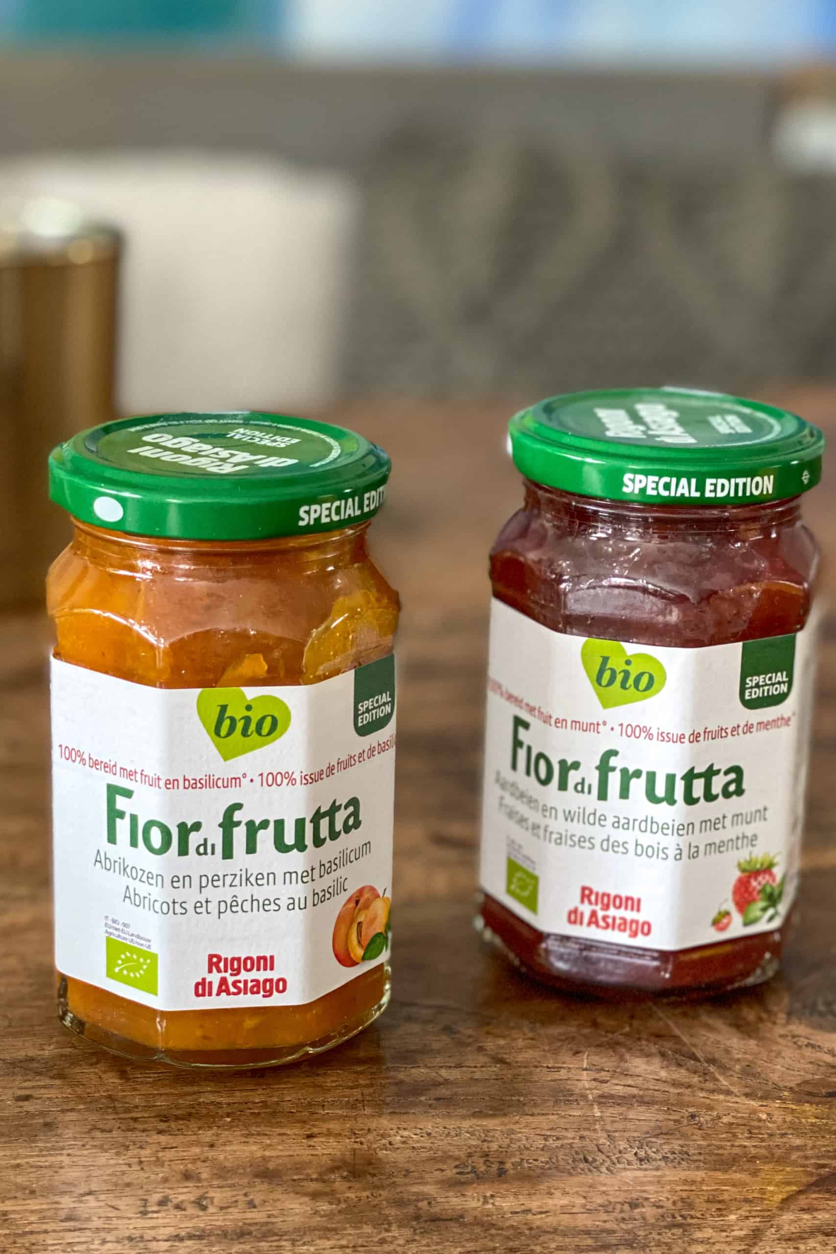 De pure fruitspread met abrikozen, perziken en basilicum van Fiordifrutta (die ik toegestuurd kreeg om te proeven) is in dit recept een echte aanwinst. Sowieso is deze fruitspread verschrikkelijk lekker. Ook voor op brood of ‘gewoon’ door de yoghurt. Hij wordt gemaakt van 100% biologisch fruit en is gezoet met appelsap, helemaal natuurlijk dus. En de smaak (het allerbelangrijkste) is waanzinnig! Ook hebben ze een special edition met aardbeien, wilde aardbeien en munt nu in het assortiment. Die is minstens net zo lekker. Als je ze zelf wilt proeven dan vind je het assortiment van Fiordifrutta bij Ekoplaza, Odin, G&W GezondheidsWinkel, speciaalzaken, natuurvoedingswinkels en -drogisterijen.