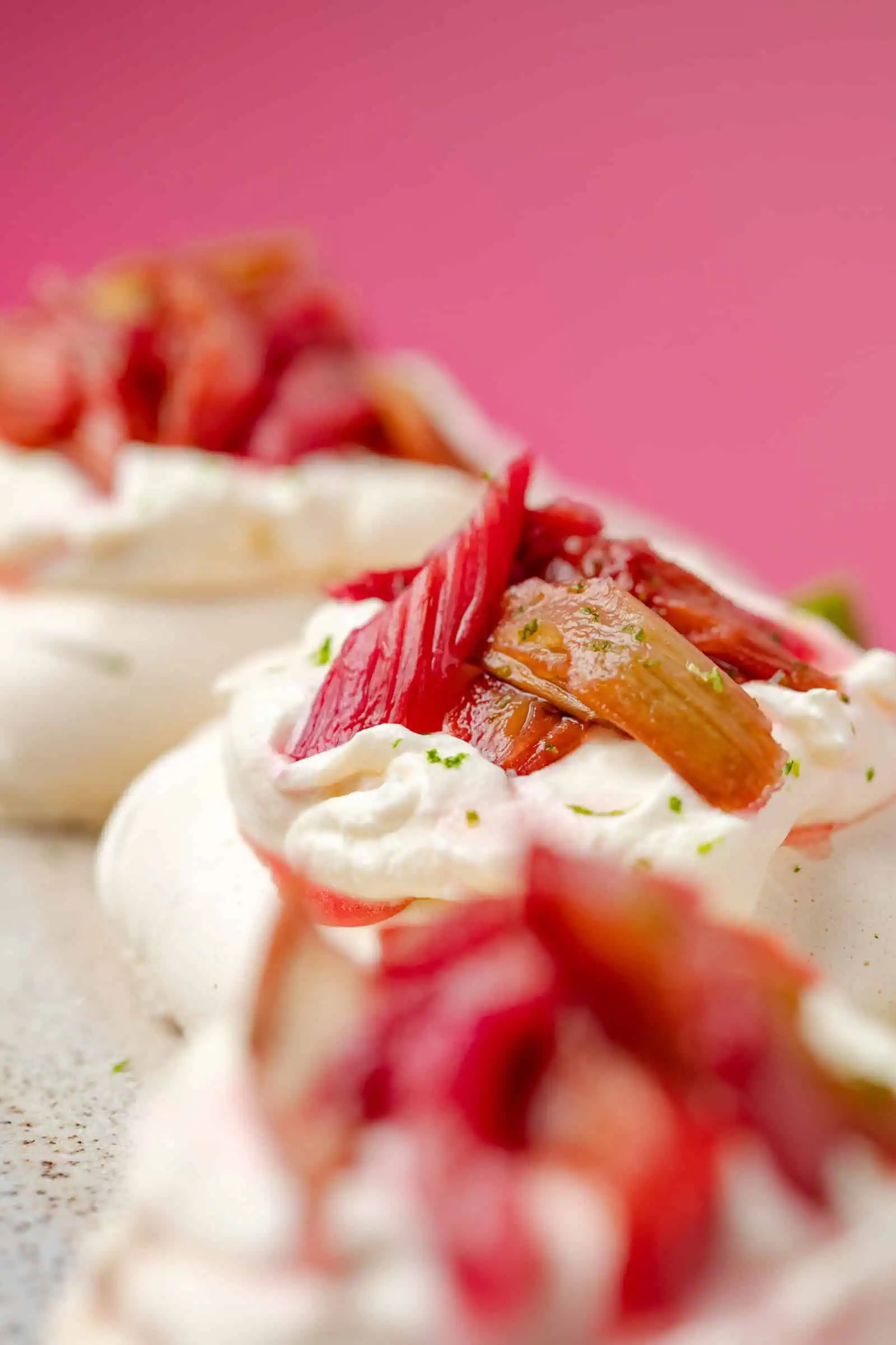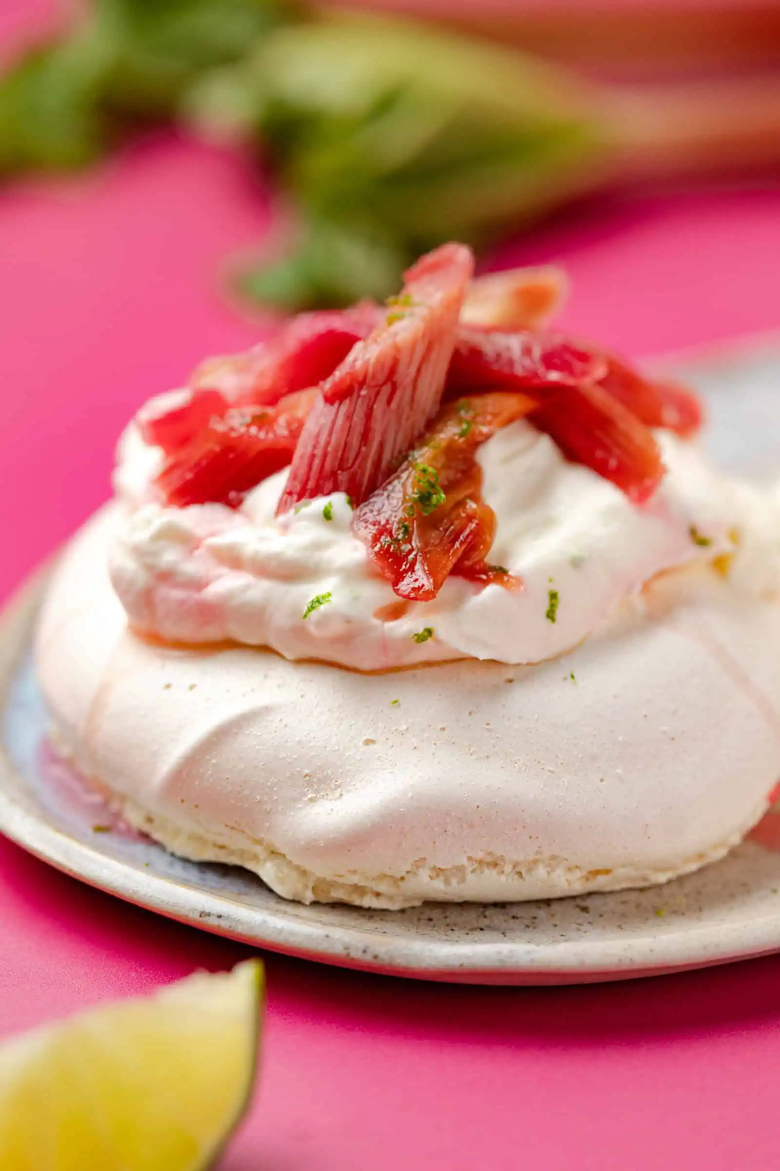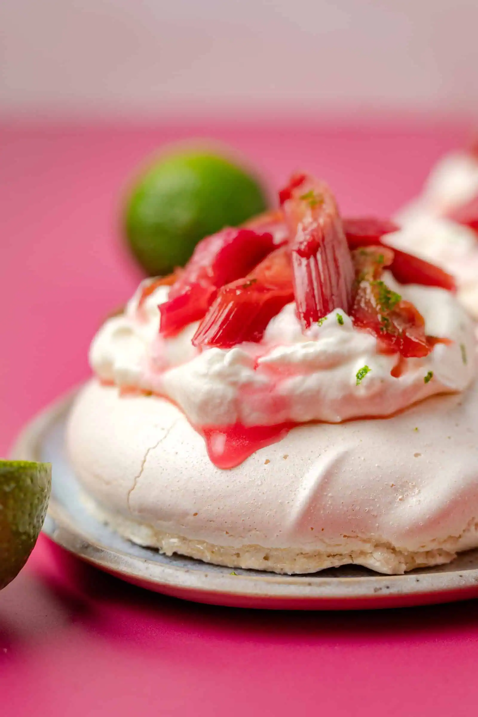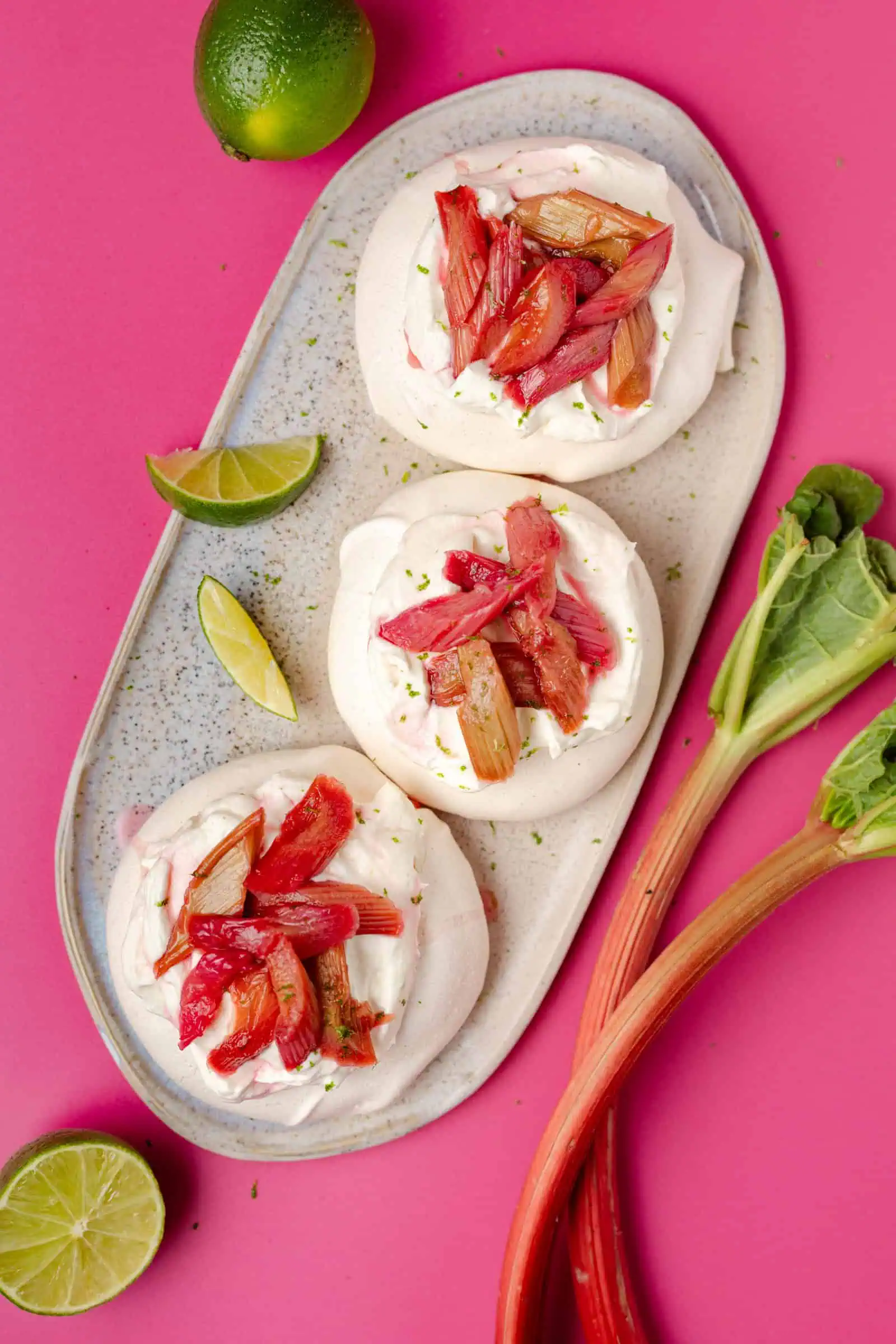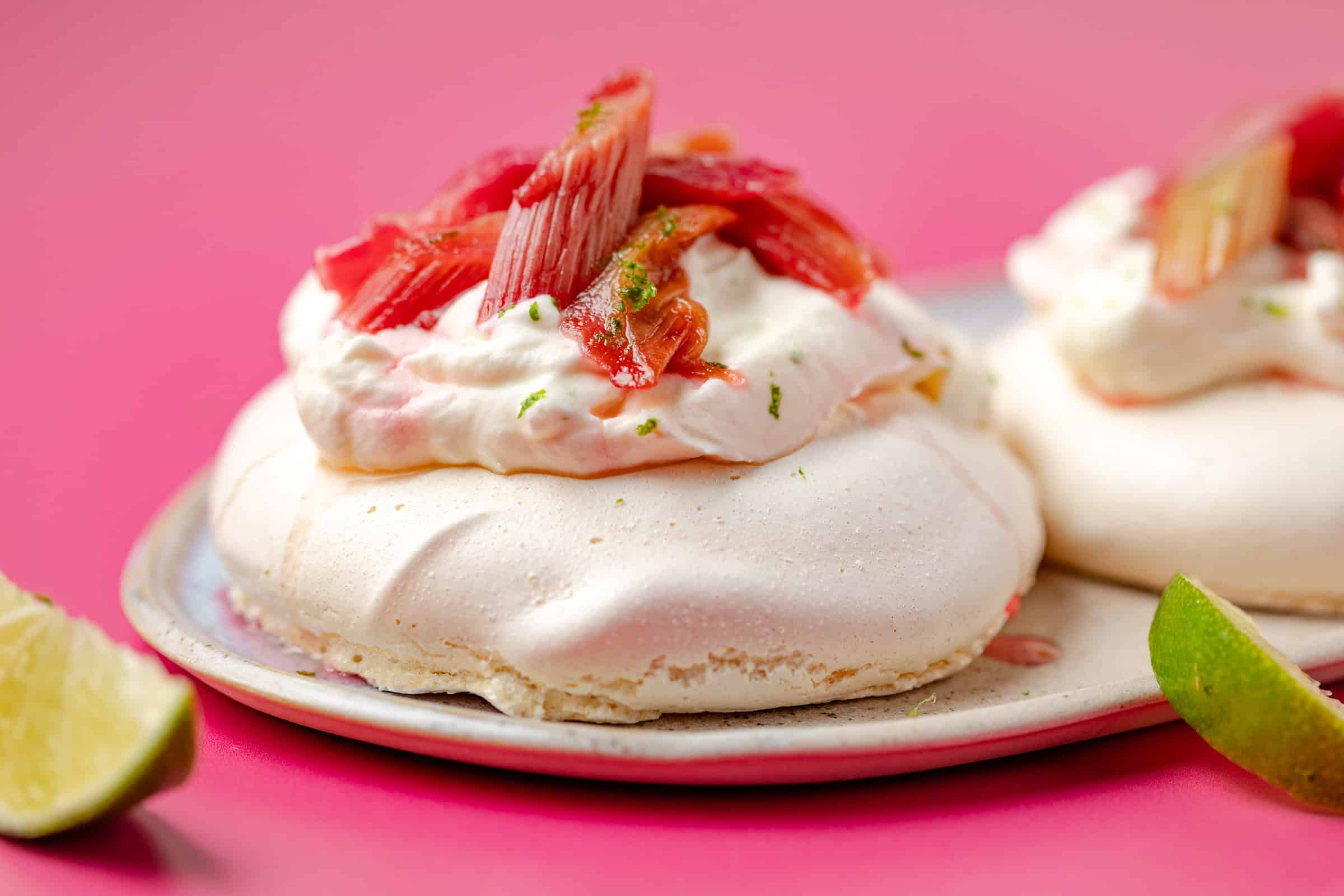Ik maak graag mini pavlova’s, omdat ze er zo schattig uit zien. De topping mogelijkheden ervan zijn eindeloos. Denk aan een romige laag slagroom, vers fruit zoals aardbeien, kiwi en passievrucht, zelfgemaakte fruitcompote, friszure yoghurt met wat kokos en geroosterde amandelen, maar ook room in combinatie met chocolade- en karamelsaus doet het goed. Maar vandaag gaan we voor een van mijn grote favorieten: zachte, geroosterde rabarber. Wat weer ontzettend goed combineert met de limoenroom. Geniet ervan!