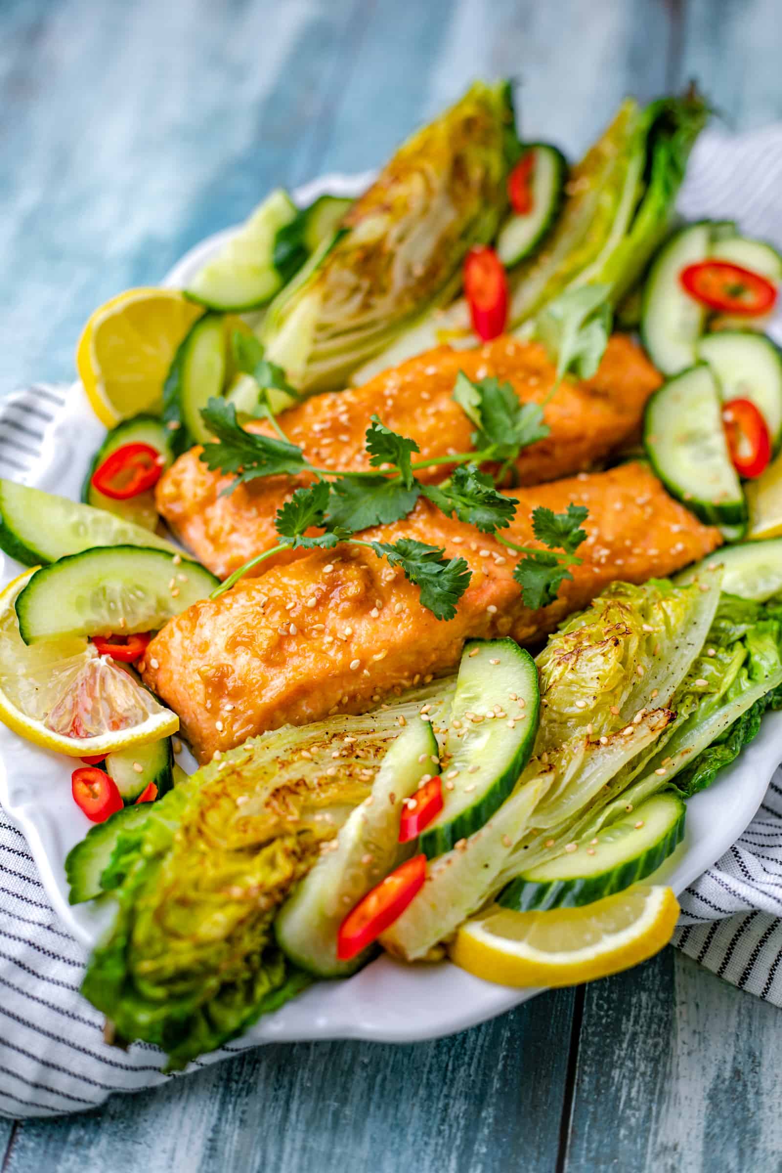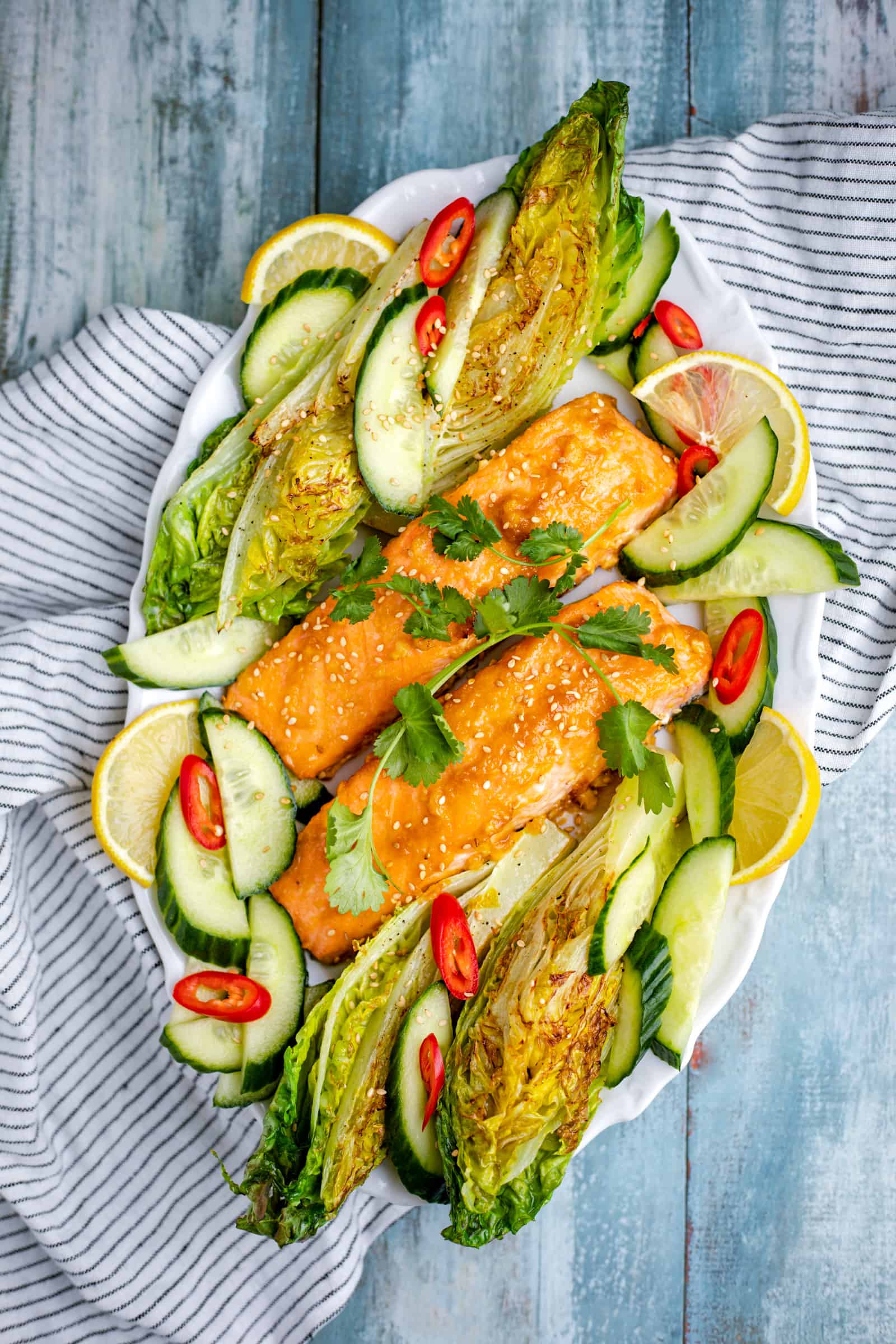 - Serveer de miso zalm met de gegrilde sla, zoetzure komkommer, partjes citroen en optioneel geroosterd sesamzaad, wat verse koriander en/of noedels.