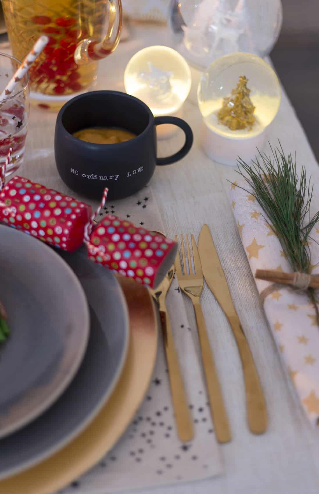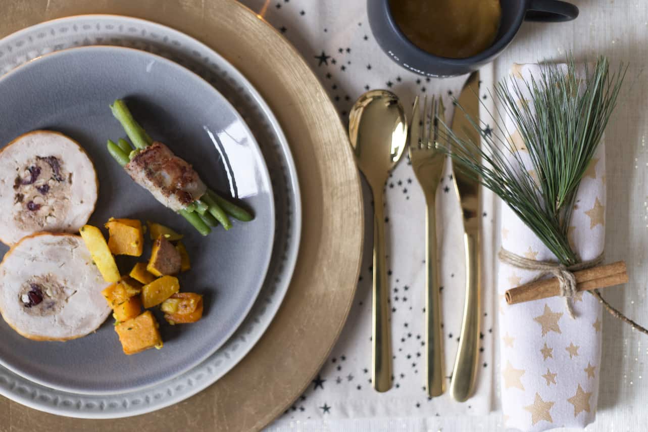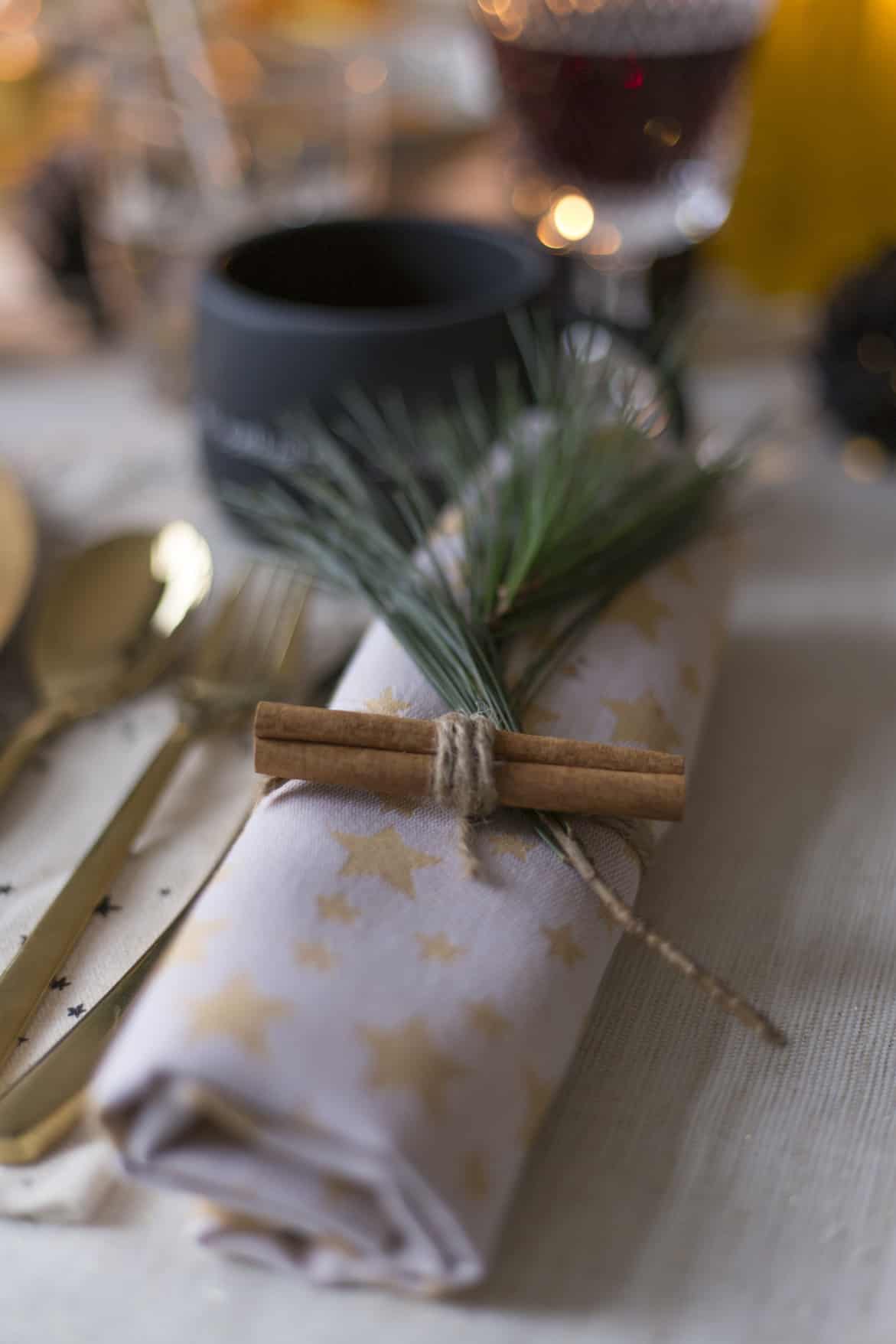 Voor het servies en bestek zijn we gaan winkelen bij winkels als Blokker, Casa, Xenos en Hema. Die hebben ieder jaar geweldige collecties met kersttafelversiering en kerstdecoratie waar je voor een betaalbare prijs kunt shoppen! Is het servet zo niet fantastisch? Met een groen takje, kaneelstokje en wat touw van het tuincentrum maak je deze helemaal zelf. Dat is trouwens ook een van de beste tips van styliste Chantal. Met wat groen, besjes of touw kun je zelf de leukste, en betaalbare, versieringen maken.