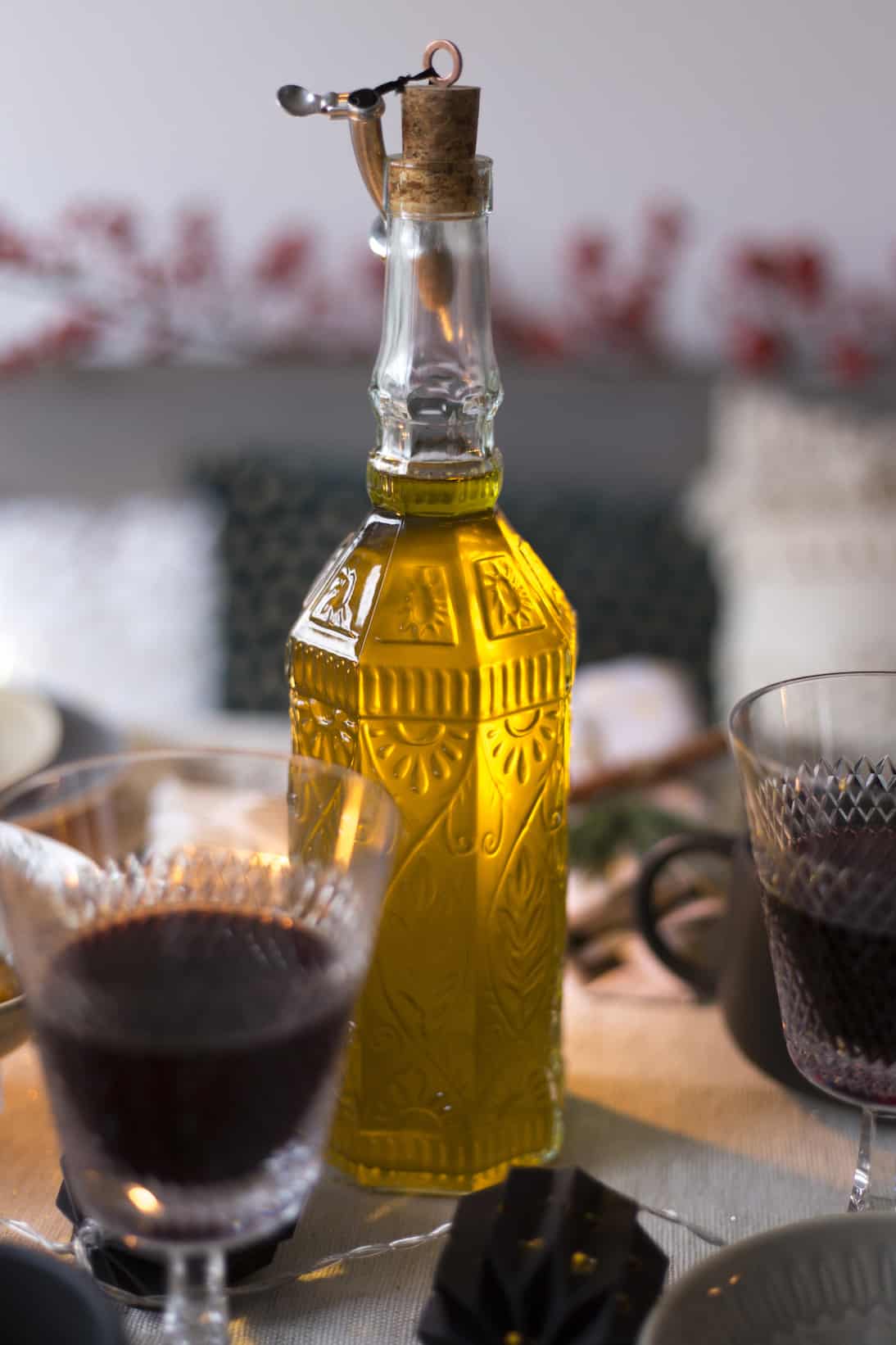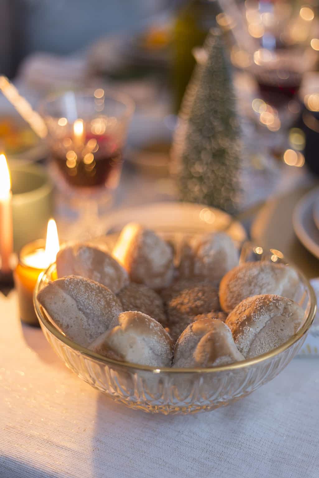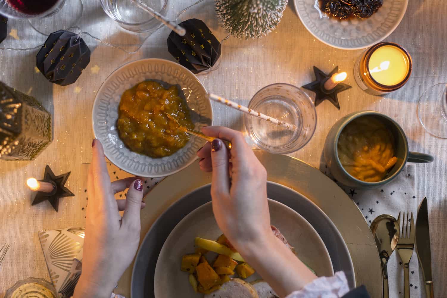 Voor het servies en bestek zijn we gaan winkelen bij winkels als Blokker, Casa, Xenos en Hema. Die hebben ieder jaar geweldige collecties met kersttafelversiering en kerstdecoratie waar je voor een betaalbare prijs kunt shoppen! Is het servet zo niet fantastisch? Met een groen takje, kaneelstokje en wat touw van het tuincentrum maak je deze helemaal zelf. Dat is trouwens ook een van de beste tips van styliste Chantal. Met wat groen, besjes of touw kun je zelf de leukste, en betaalbare, versieringen maken.