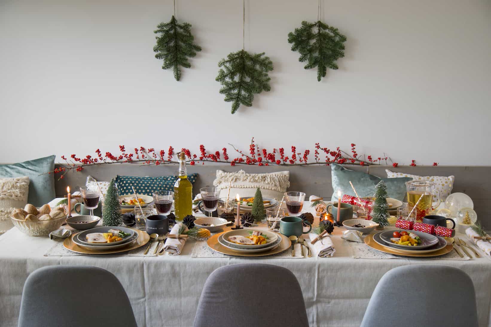 Neem voor een diner met de familie als basis een tafelkleed met bijpassende servetten in een neutrale kleur. Dit geeft je eettafel gelijk een luxe uitstraling. Combineer dit met servies en bestek in een kleurthema. Wij kozen dit jaar voor goud en aqua groen met een aantal rode details. Dit ziet er heel feestelijk uit, maar zorg er ook voor dat het niet te stijf wordt als je met kinderen gaat eten. We voegden ook nog wat bessen- en kersttakken toe voor de speelsheid.