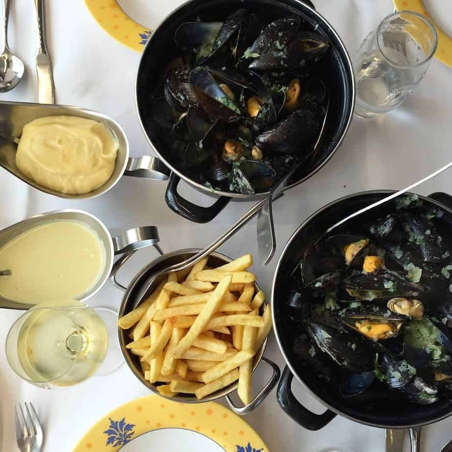 Dan het hoofdgerecht, een pannetje met mosselen. Hoe kan het ook anders. Bij Au Port kun je kiezen voor Provençaalse mosselen, met room of naar het familierecept. Wij kozen uiteraard voor de laatste. Frank vertelt ons dat je niet teveel moet toevoegen qua smaken aan verse mosselen. Die zijn zo puur van smaak dat je het product nog steeds wilt proeven. Ze worden kort gekookt in hun eigen vocht (verse mosselen hebben nog zoveel eigen vocht in de schelpen dat je geen extra vocht hoeft toe te voegen) en er wordt verder alleen ui en peterselie aan toegevoegd. En witte peper, heel veel witte peper.