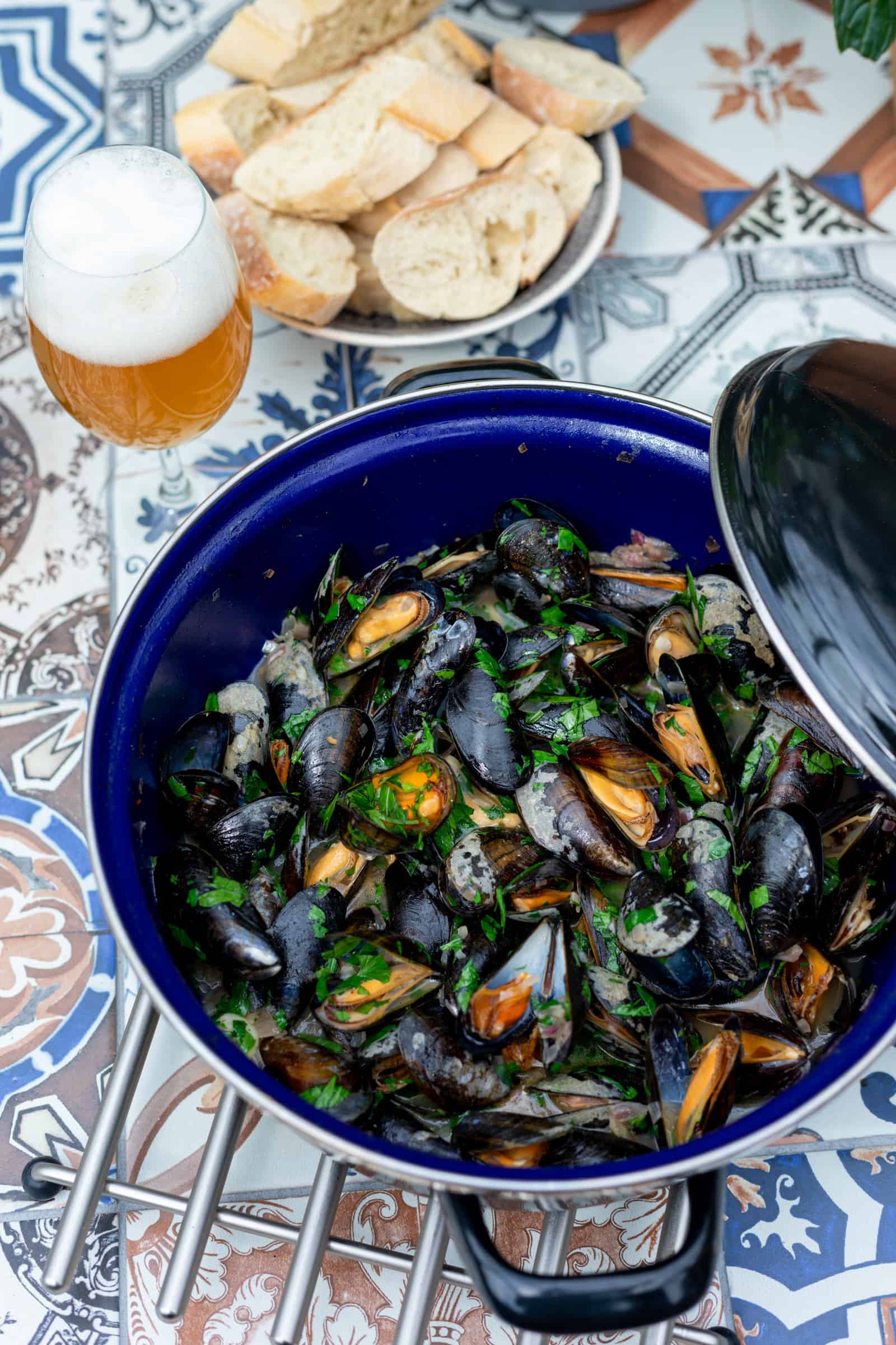 - Serveer de mosselen van de barbecue in de pan samen met het stokbrood.