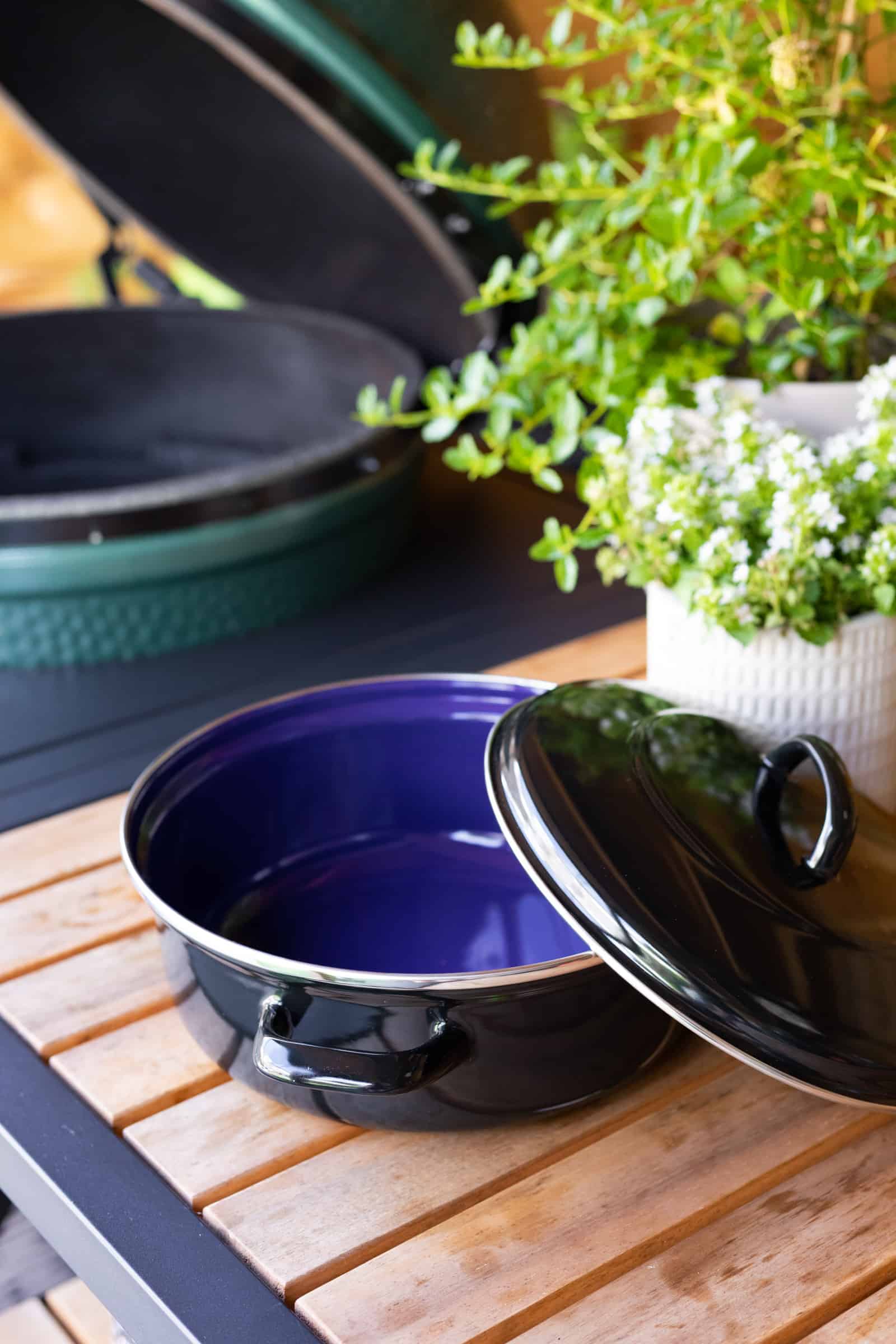 Wat zijn ze lekker, deze mosselen van de barbecue! Het was even zoeken voor me naar de juiste bereidingstechniek, omdat ik ze het liefst net als in de keuken wilde stomen in de pan. Maar de pannen die ik in huis had, waren of niet vuurvast of te hoog (waardoor de deksel van de kamado niet kon sluiten). Inmiddels heb ik ‘m gevonden hoor! Ik bestelde deze Fortalit braadpan van BK (de 4 liter pan past heel goed op onze Big Green Egg Large) en die werkt perfect op de barbecue. Door het geëmailleerde plaatstaal wordt de pan razendsnel heet en je kunt er zowel in bakken, stomen als stoven. Op de barbecue, in de oven en op mijn inductieplaat binnen. Daar kan ik dus veel meer mee dan alleen mosselen maken, en dan wordt een pan pas echt heel handig ;-).