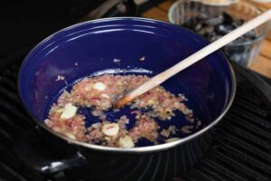 - Smelt een klontje boter in de voorverwarmde pan en fruit de sjalot en knoflook een paar minuten. Schenk een scheut ciderazijn erbij, roer door en laat verdampen. Schenk het bier in de pan en roer de barbecuesaus erdoor.