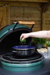 - Zet al je ingrediënten klaar naast de barbecue. Plaats het rooster hoog in de barbecue en zet daar de pan op zodat deze kan voorverwarmen. Sluit in de tussentijd het deksel van de barbecue als je een kamado hebt.