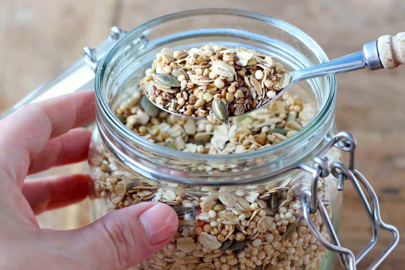 - Meng in een kom de boekweit met de havervlokken, pompoenpitten, lijnzaad, gepofte quinoa, kaneel, gemberpoeder en nootmuskaat. Giet over in een pot en jouw zelfgemaakte muesli is klaar voor gebruik!