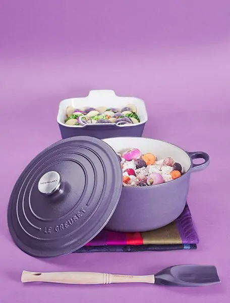Ja, ook ik hou van Le Creuset. Ik herinner me nog de enorme oranje Flame uitvoeringen, nu oh zo retro, van vroeger. De tijd van schreeuwend oranje is allang voorbij. Kleur staat volledig centraal bij het merk en ze grossieren in de meest prachtige tinten. Het lijken soms wel snoepjes in plaats van ‘saaie’ keukenattributen, bijna onweerstaanbaar.