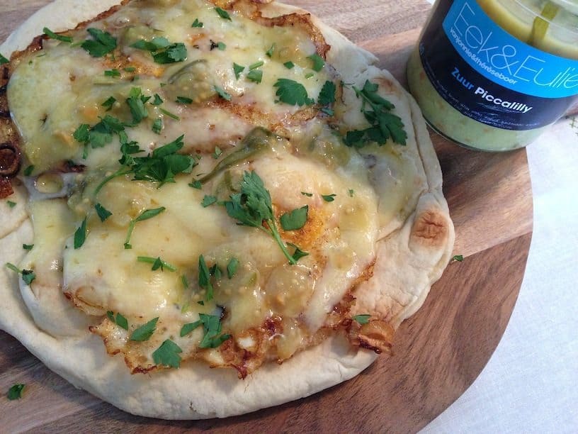 Tip, ook erg lekker! Beleg een naan met een gebakken eitje, jong belegen kaas en wat piccalilly.