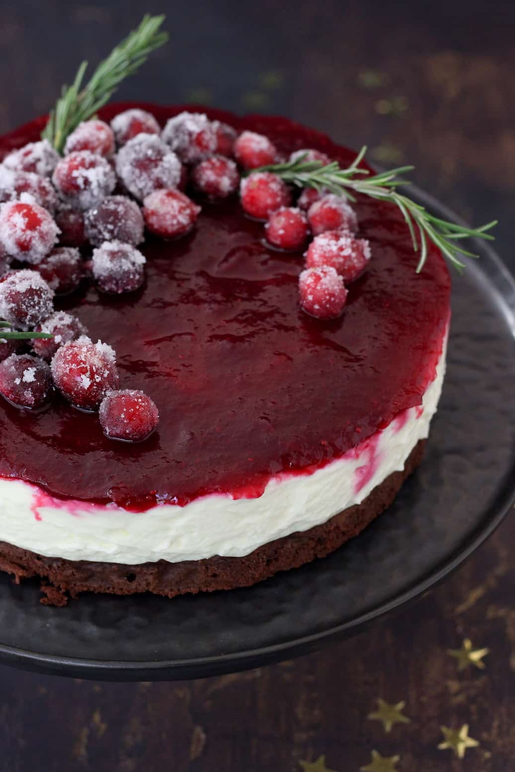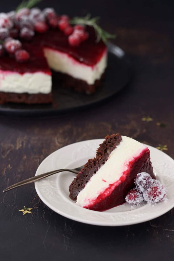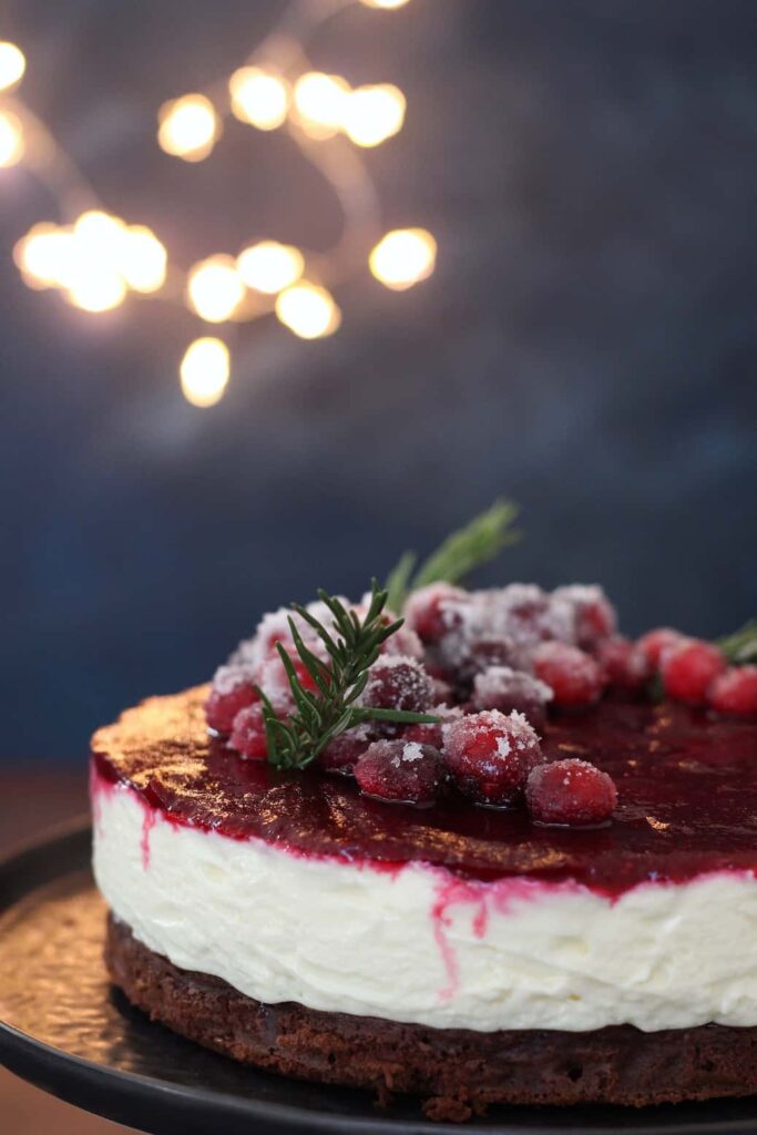 Na het bakken liet ik de bodem afkoelen en maakte de romige cheesecake vulling met witte chocolade. Deze ging de koelkast in om op te stijven en in de tussentijd maakte ik als topping een cranberry coulis met een vleugje rozemarijn. Deze ging als laatste over de cheesecake. De decoratie bestaat uit gesuikerde cranberries en wat takjes rozemarijn. Een geweldige showstopper voor op tafel en het mooie is dat je ‘m al een dag eerder kunt maken en afgedekt bewaard in de koelkast tot gebruik.