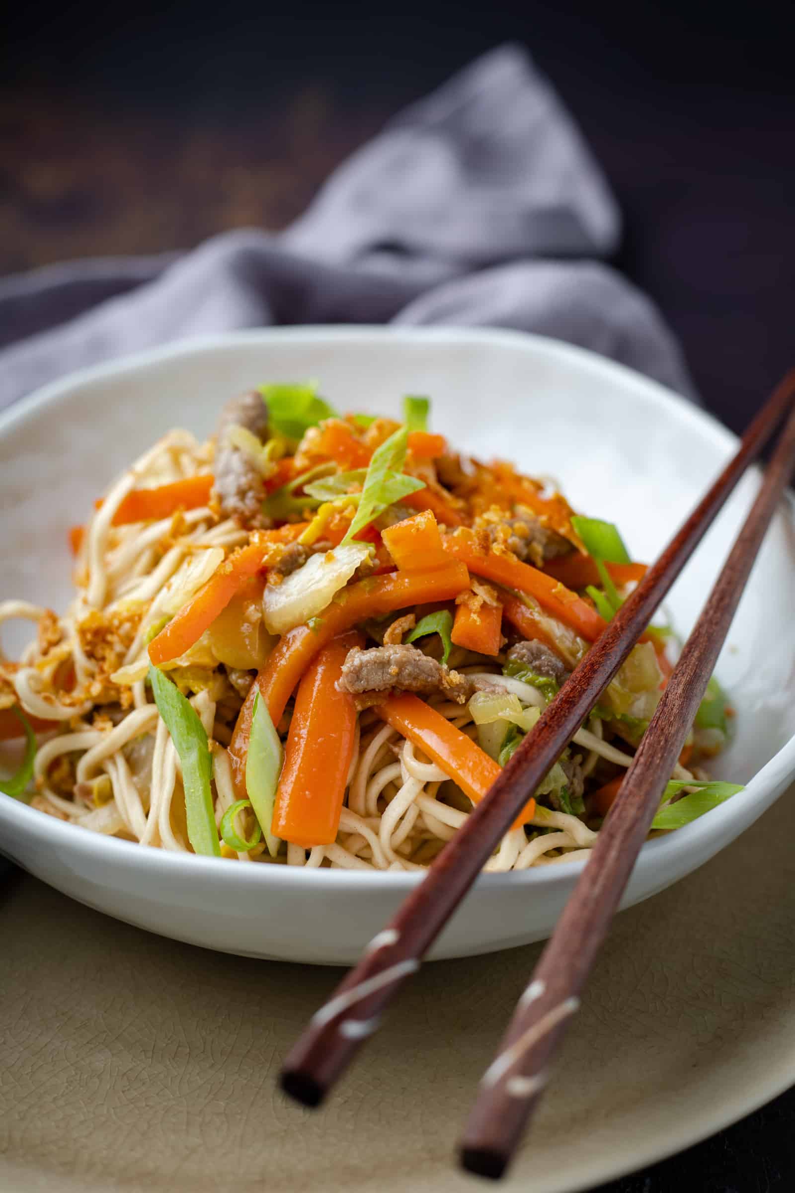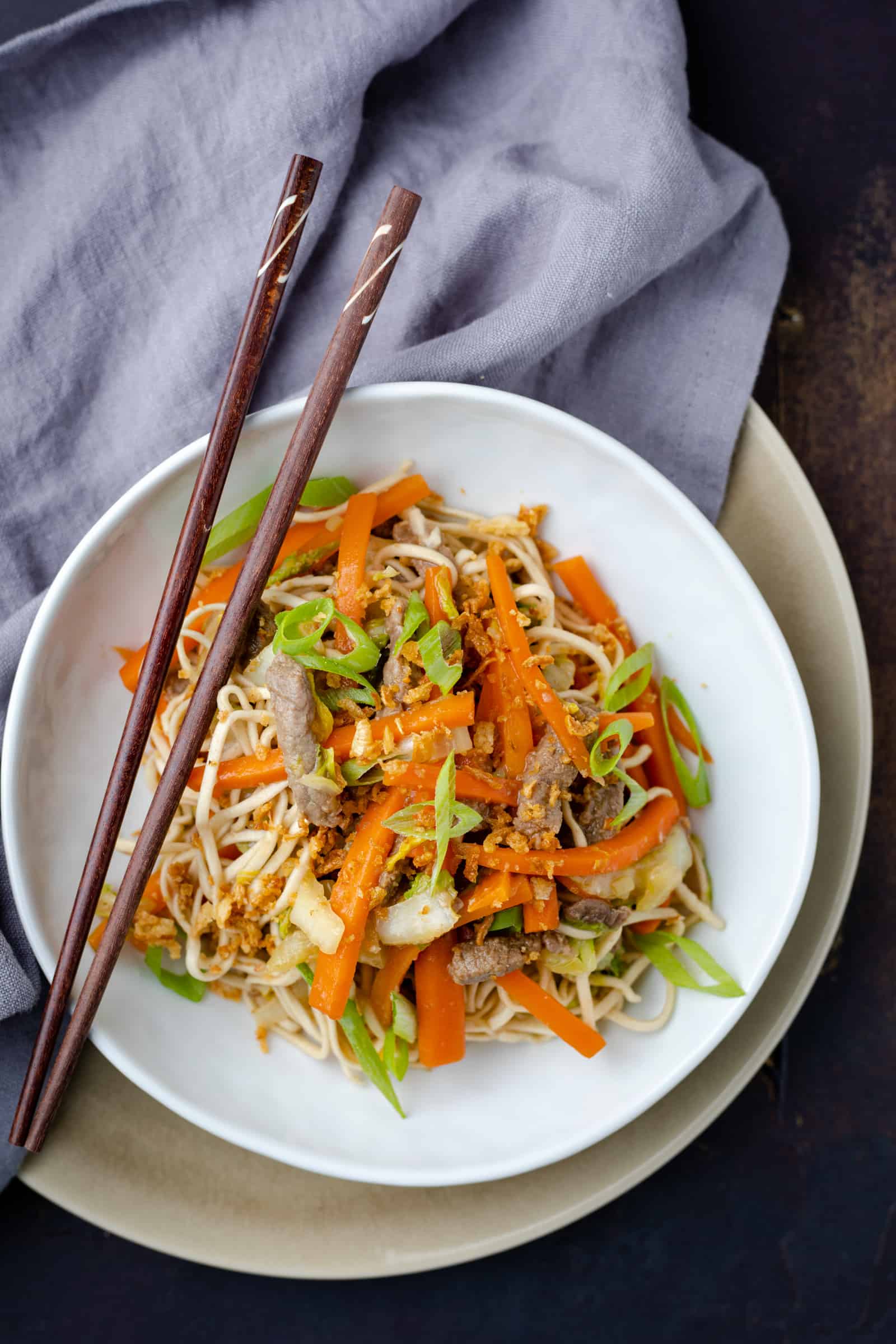 - Serveer de noedels met groenten en biefreepjes in diepe borden of kommetjes en garneer met het groen van lente-ui en wat gebakken uitjes.