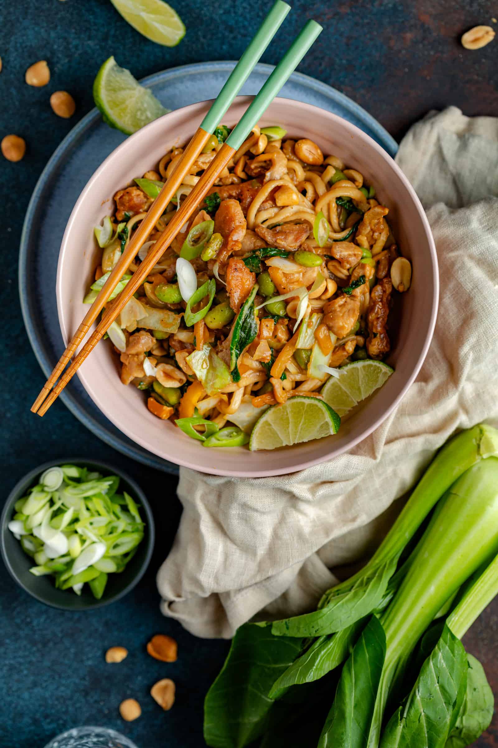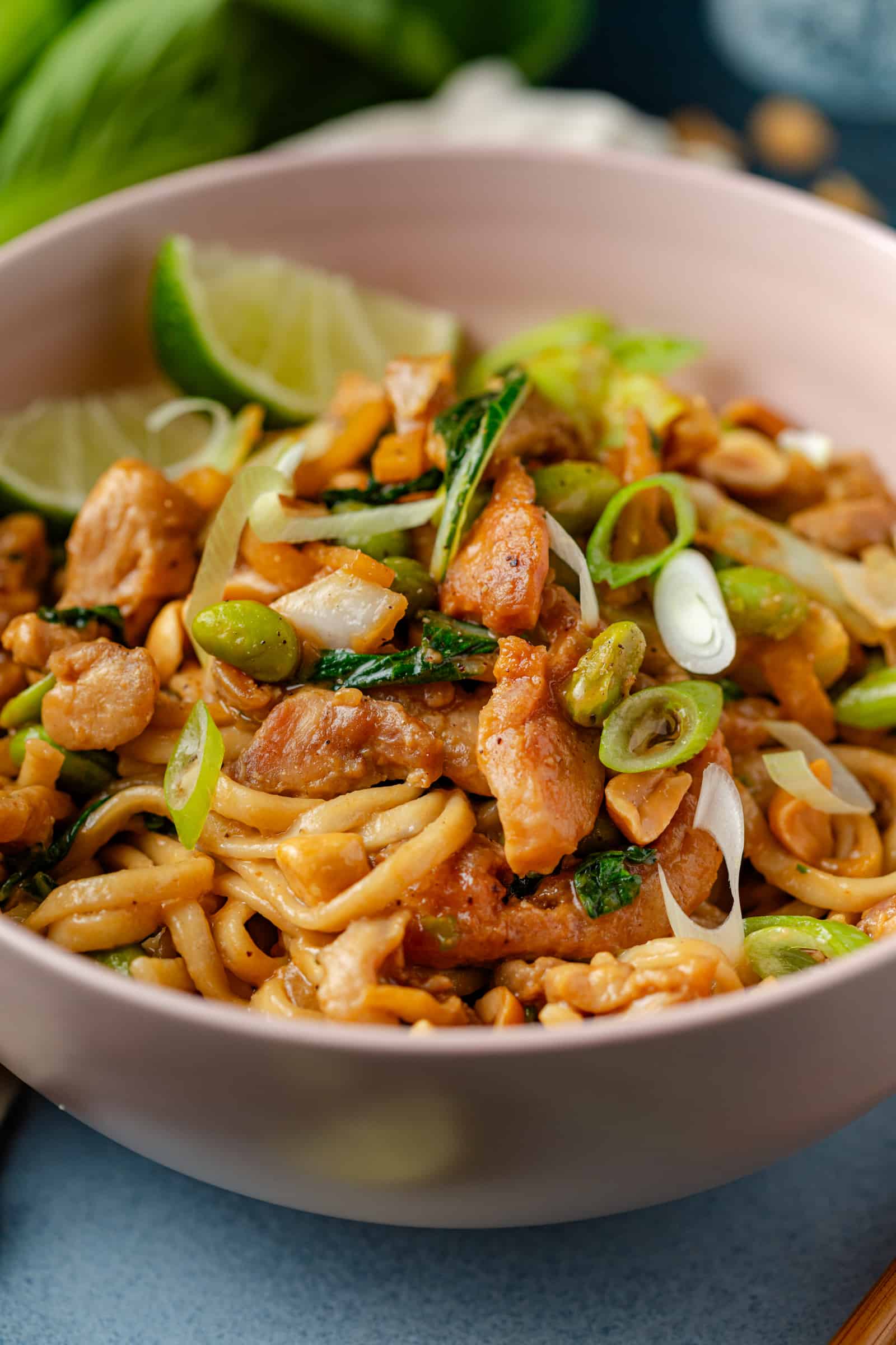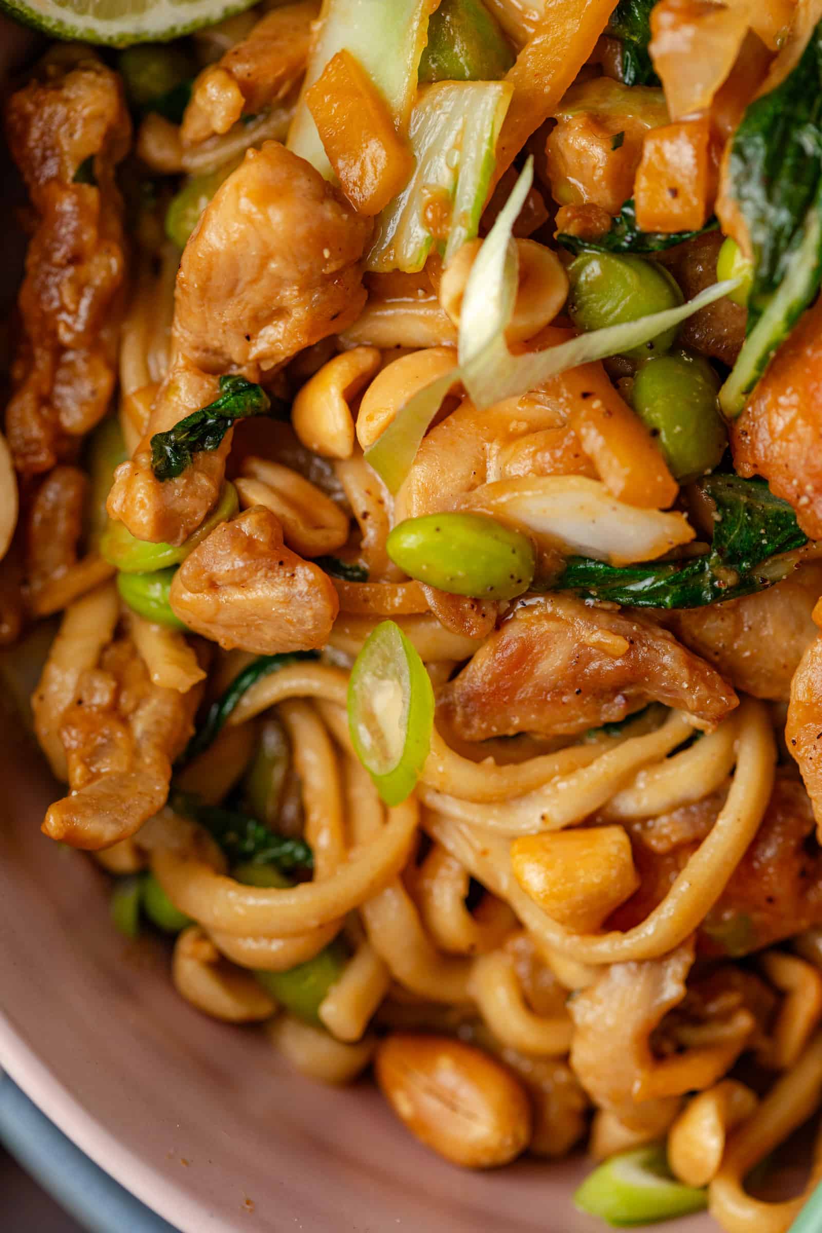 - Schep een royale portie noedels met krokante kip en groenten op een bord, garneer met de lente-ui, pinda’s een partje limoen en geniet!