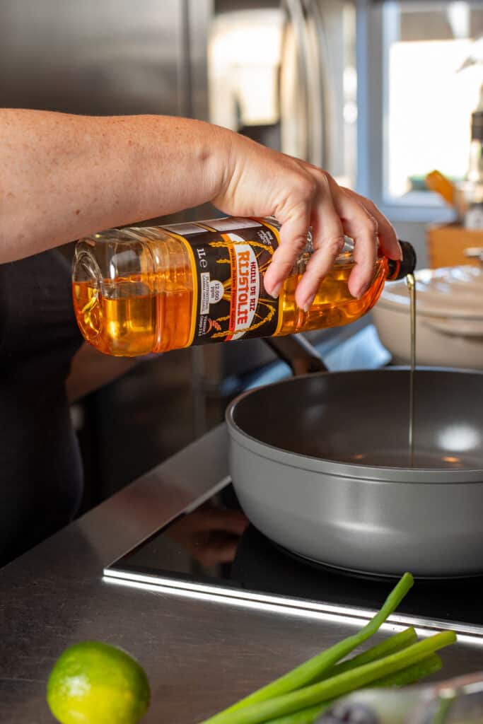 Om de kip goed krokant te bakken heb ik de rijstolie van Alesie gebruikt. Naast een bron van onverzadigde vetten is rijstolie ook heel neutraal qua smaak. Het rookpunt van deze olie ligt heel hoog, net boven de 250°C, en daarom is ‘ie perfect om in te frituren of in dit geval je kip goed krokant te bakken en dat maakt deze noedels met pindasaus het allerlekkerst!