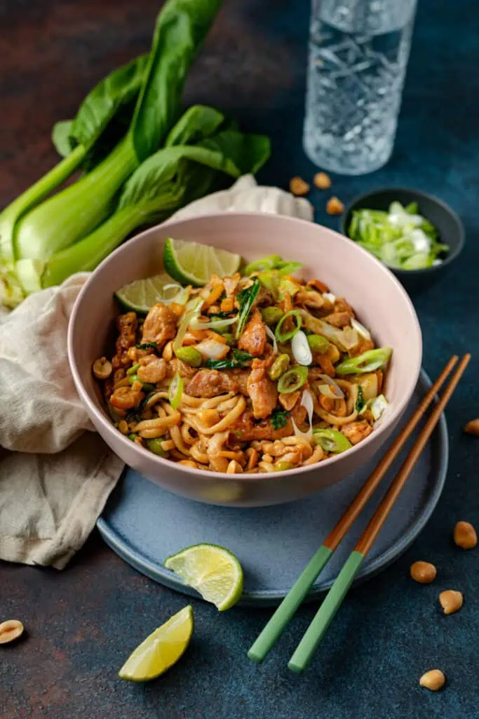 De pindasaus maak je heel makkelijk zelf met onder andere pindakaas, sojasaus, ketjap, rijstazijn, sesamolie, knoflook en gember. Uiteindelijk komen de noedels, groenten, kip en pindasaus bij elkaar in één pan, binnen een half uur kun je aan tafel. Geniet ervan!