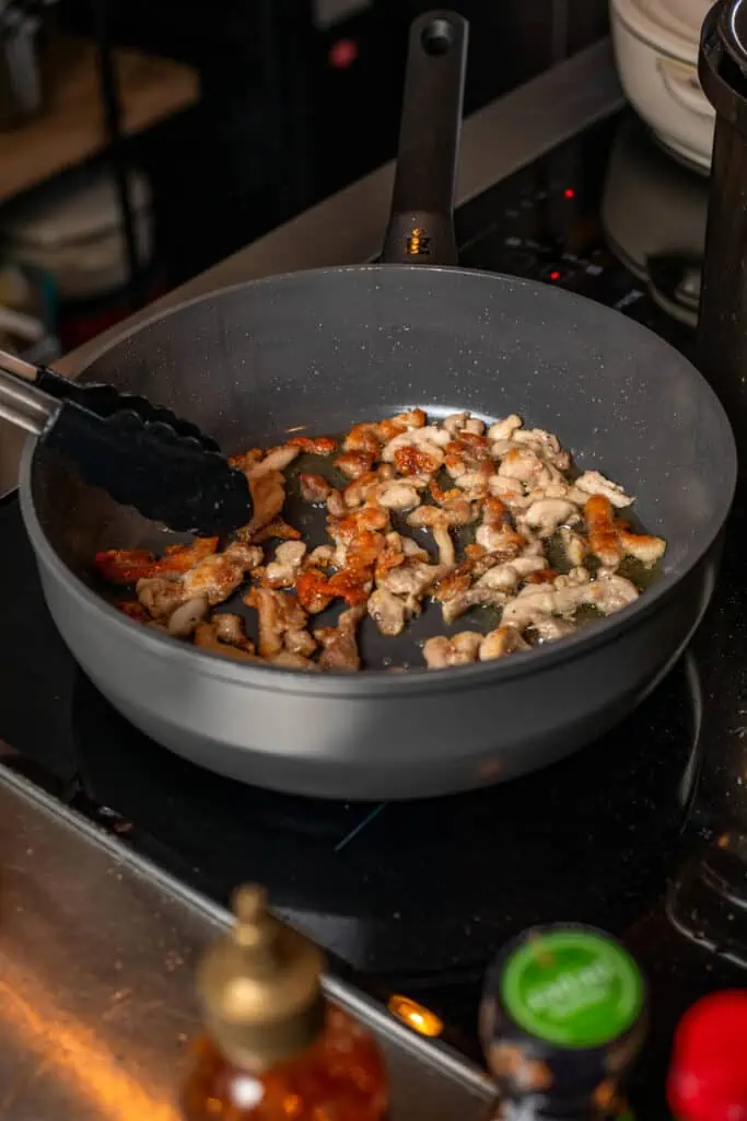 - Verhit een hapjespan- of wok op hoog vuur en schenk er royaal rijstolie in. Bak hier de reepjes kippendijen, met een royale snuf zout en peper, rondom goed bruin en krokant aan. Eigenlijk ben je half aan het frituren, dat zorgt voor de krokante buitenkant. Dit kan even duren, geef het de tijd.