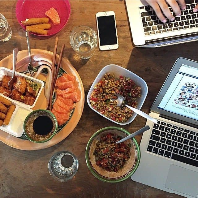 Zelf koken natuurlijk! Zo’n 4 tot 5 keer in de week. Daarnaast een mix van buiten de deur eten (bij vrienden/familie, in restaurants of bij persevents) en op de dagen dat ik echt nergens zin in heb, wordt er eten besteld of gehaald.