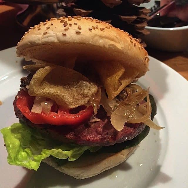 Dat wordt dan een broodje met hamburger en truffel. We hebben ‘m kerstavond nog gemaakt; geroosterd hamburgerbroodje besmeerd met dun laagje truffelolie, sla, Black Angus burger, coeur de boeuf tomaat, Crick’s ketchup, mosterd, uienringen en truffel chips. En die noemen we dan de, euh, Francesca’s Truffelburger of zoiets?