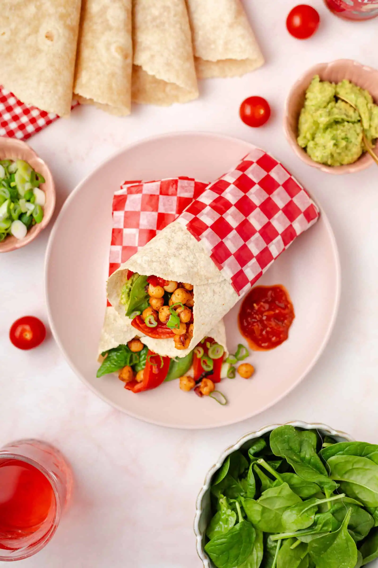 • Beleg een oat tortilla met wat avocadospread, blaadjes spinazie, geroosterde paprika, kikkererwten en lente-ui.