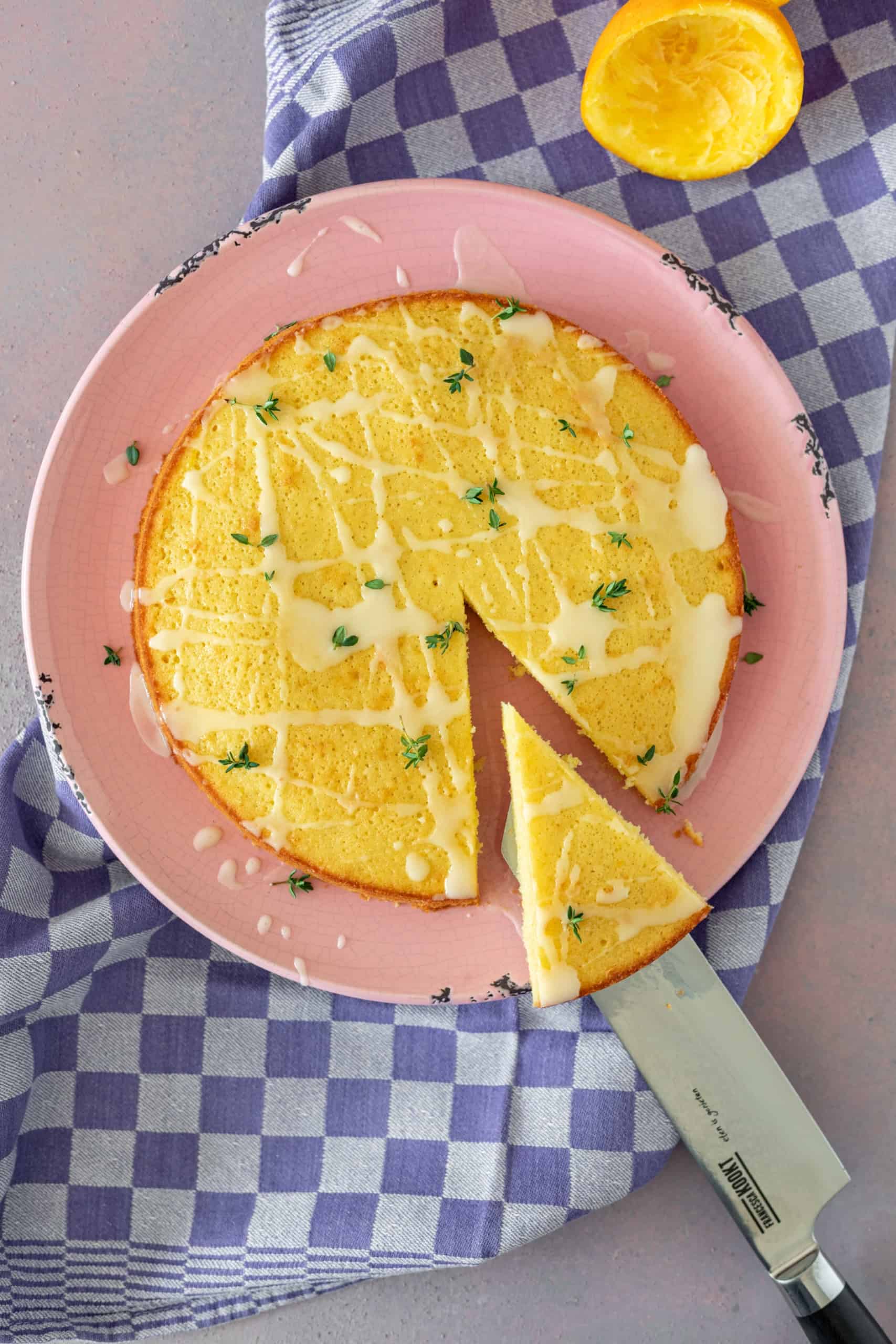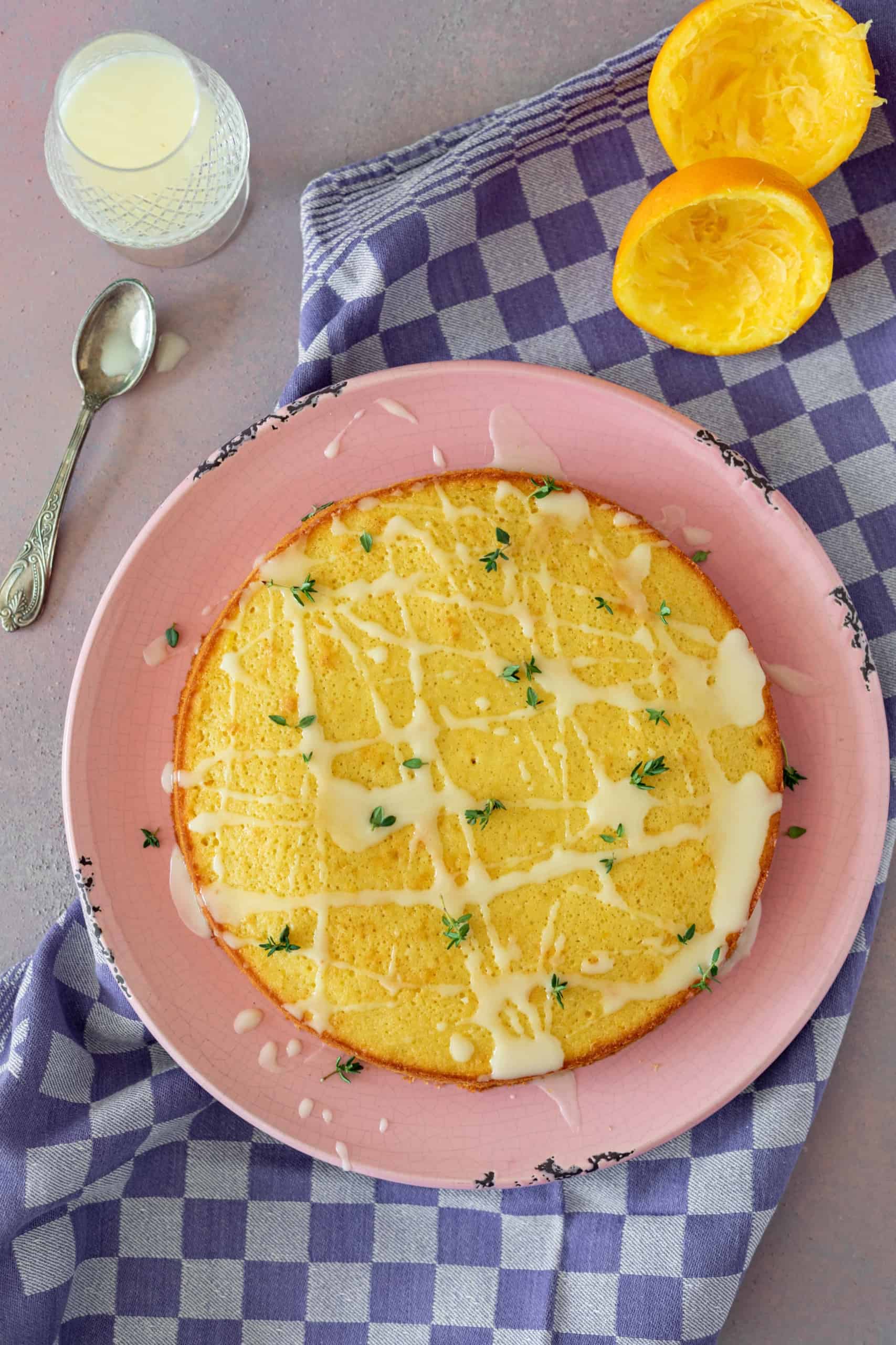 - Als de olijfoliecake helemaal is afgekoeld kun je deze decoreren met sinaasappelglazuur. Doe daarvoor de poedersuiker in een kommetje en voeg beetje bij beetje wat van de eetlepel sinaasappelsap toe. Tot het glazuur een papje wordt wat net vloeibaar is waardoor je het kunt schenken. Garneer hiermee de taart en strooi er nog wat fijne blaadjes verse tijm over.