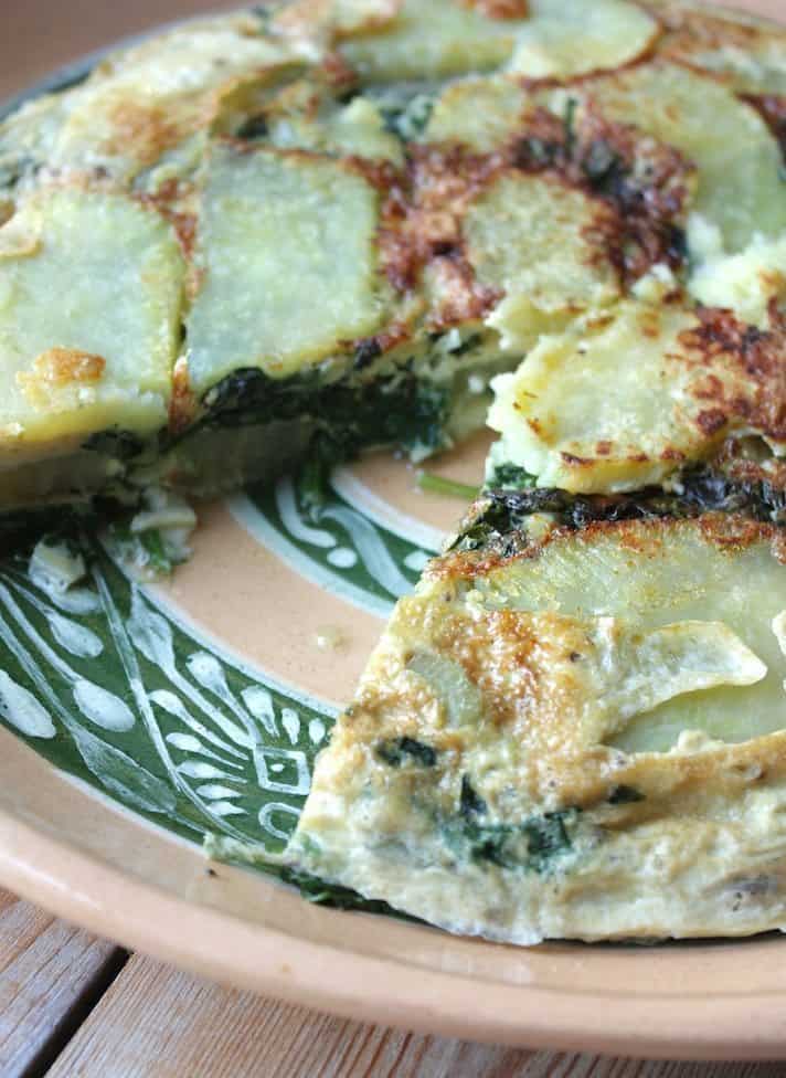 Leg een groot bord op de pan en draai daarna het geheel om. De omelet zou nu perfect op je bord moeten landen. Maar ik zeg er eerlijk bij dat er bij mij nog een klein stukje in de pan bleef hangen. Niet druk om maken, gewoon uit de pan halen en weer netjes op je omelet draperen. Snijd de omelet in 8 punten en serveer. Lekker met een frisse groene salade met vinaigrette erbij.