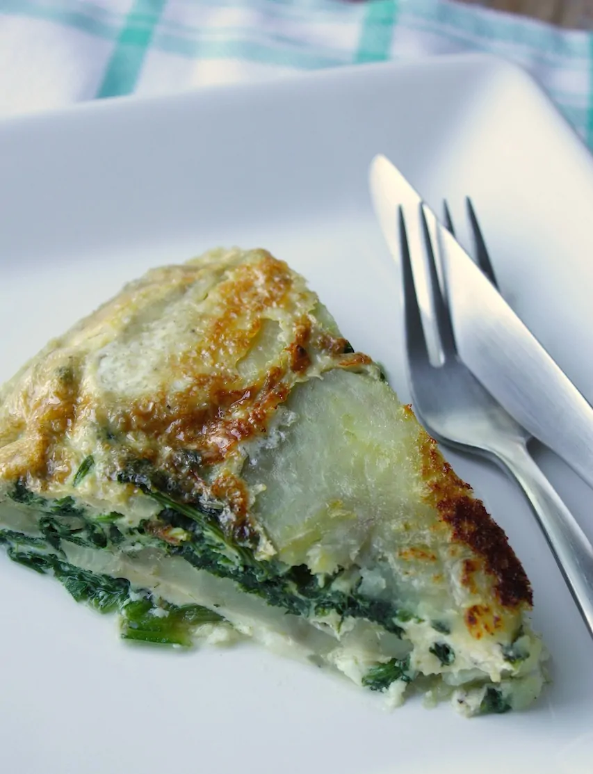 Pak een hapjespan die groot genoeg is voor alle ingredienten en vet deze van binnen helemaal in met olie. Zet op laag vuur en schenk er nog een scheutje olie in. Beleg de onderkant van de pan met de helft van de plakjes zoete aardappel. Schep hier de helft van de gebakken spinazie op en verdeel dit gelijkmatig. Schenk hierover de helft van het eimengsel. Verkruimel de helft van de feta en strooi erover samen met wat peper. Herhaal dit voor de volgende helft. Je eindigt dus met een laag feta en peper. Zet het deksel op de pan en laat de omelet nu stollen. Houdt het vuur laag, want anders verbrand de onderkant en dat is zonde. De omelet is gaar als de bovenkant ook gaar is.