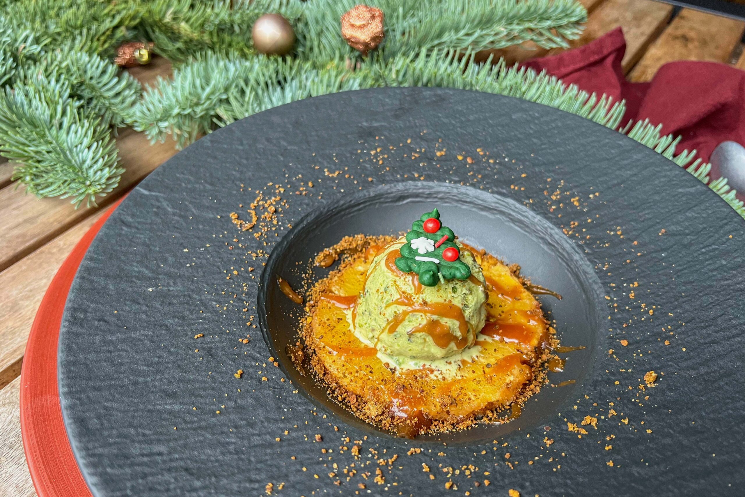 Daar moest natuurlijk nog wel wat bij komen, bij die goddelijke gegrilde ananas. Dat werd een karamel waar ik nog wat passievrucht likeur aan toevoegde. Verder een bolletje pistache ijs, een zelfgemaakt chocoladekerstboompje en als laatste pistache crumble. Wat een knaller van een dessert!