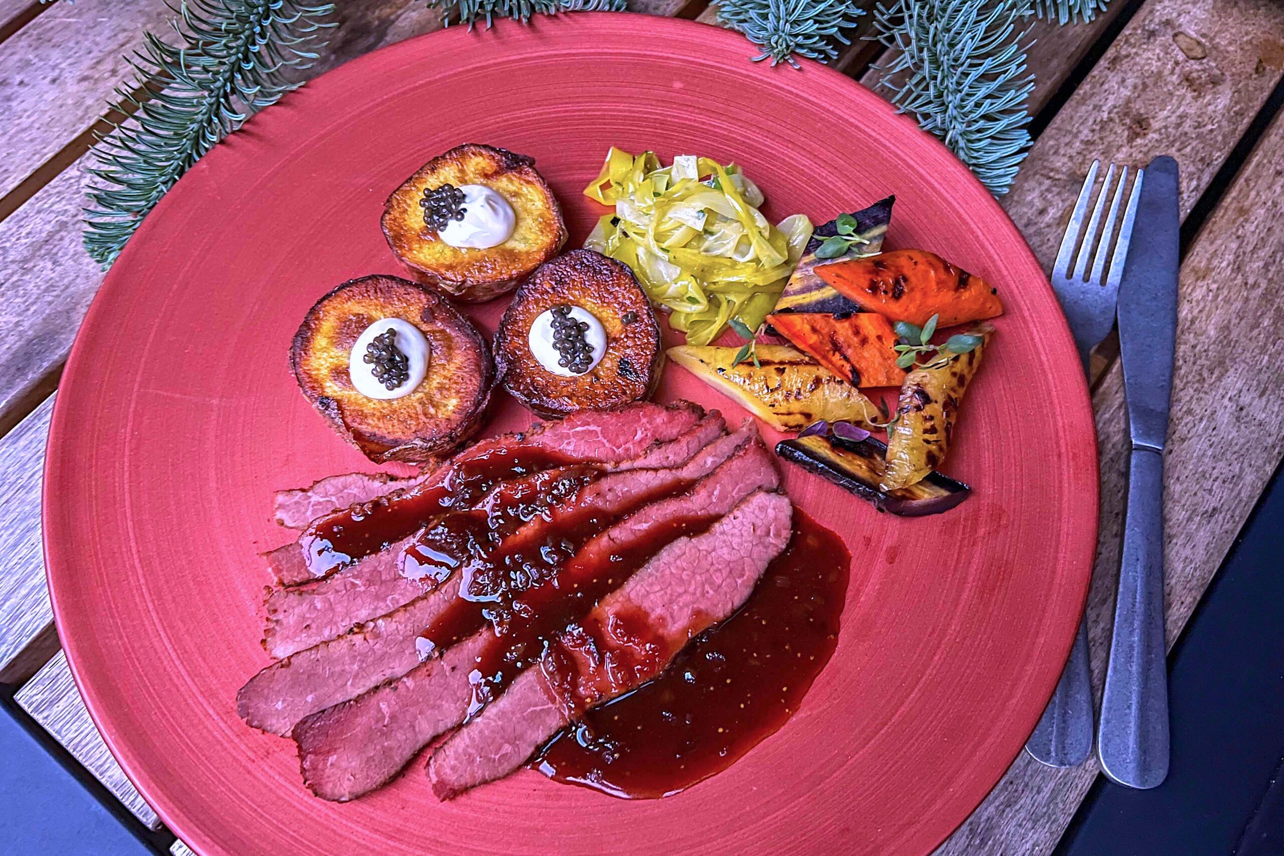 - Hoofdgerecht: Dungesneden pastrami met vijgen-portsaus + Krokante aardappels van de BBQ met crème fraîche en kaviaar + BBQ preisalade met vinaigrette + Geroosterde winterpeen