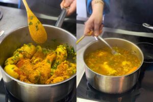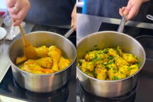- Meng de kikkererwten en rozijnen in een steelpan en voeg de laatste 5 minuten wat jus toe uit de pan van de kip. Ongeveer een kleine pollepel en daarmee verwarm je het. Aan de spitskool voeg je ook een pollepel jus uit de pan toe en daarmee kook je het ook nog 5 minuten.