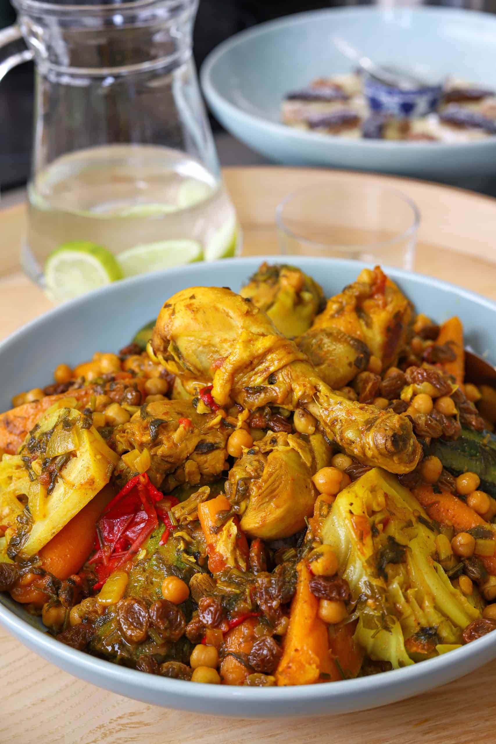 - Pak een grote, brede schaal en schep de couscous in de schaal. Decoreer de couscous door rondom de verschillende groenten te leggen. Leg bovenop de kip en nog een paar drumsticks rondom. Schep de kikkererwten met rozijnen erover en schenk als laatste nog wat bouillon erover voor de smaak. Maar niet te veel, want de couscous moet niet gaan zwemmen. Het gaat om de smaak. Serveer de Marokkaanse couscous op tafel en laat iedereen zelf opscheppen. Geniet enorm!