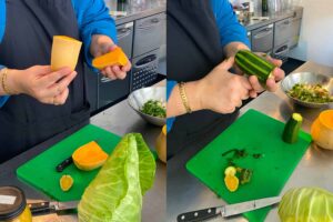 - De groenten ga je allemaal snijden in grove stukken. De wortels schil en snijd je doormidden. Van de puntpaprika verwijder je de zaadlijsten en daarna snijd je ze in grove, grote stukken. De courgette snijd je doormidden en daarna halveer je iedere helft in de lengte. Je kunt ook nog dunne strepen maken op de schil, dat ziet er mooi uit tijdens het serveren.
