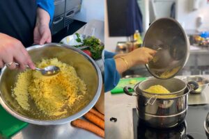 Echt lekkere Marokkaanse couscous moet je gewoon stomen. Maar er is volgens Nadia één manier waarop het anders zou kunnen, voor als je bijvoorbeeld geen stoompan hebt (maar ook daarvoor hebben we een oplossing, zie hieronder). Voor de alternatieve manier gebruik je de fijne couscous (naast fijne couscous bestaat er ook moyen (medium) couscous en die gebruik je in de stoompan) en die doe je in een pan of grote kom. Vervolgens kook je water en dat schenk je op de couscous. Dan roer je het door en giet je het water af (een fijnmazige zeef is daar handig bij). Dan kook je weer water, schenk je het erop en herhaal je het afgieten weer. Er mag nog wel iets van water achterblijven, maar zeker niet te veel want dan wordt de couscous plakkerig in plaats van dat je een fijne, luchtige korrel krijgt. Zet de deksel op de pan en laat het een half uur tot een uur staan. In die tijd zal de fijne couscous garen en kun je ‘m verder gebruiken. Tot zover bereidingswijze twee, die volgens Nadia nog acceptabel is.