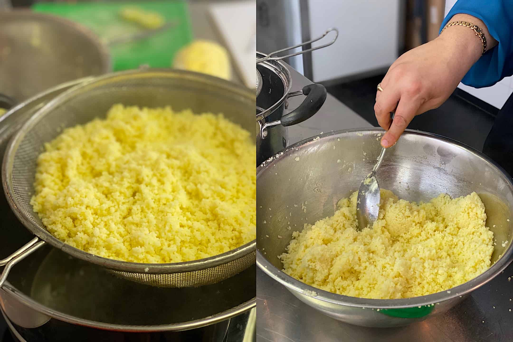 - Tijd om de couscous te stomen. Dit kun je doen in een echte couscouspan of je doet het zoals wij het deden. We gebruikten een grote fijnmazige zeef die precies paste in een grote pan. Daarvoor moet je even passen en meten, want het moet wel passen. Maar dit kan dus wel.