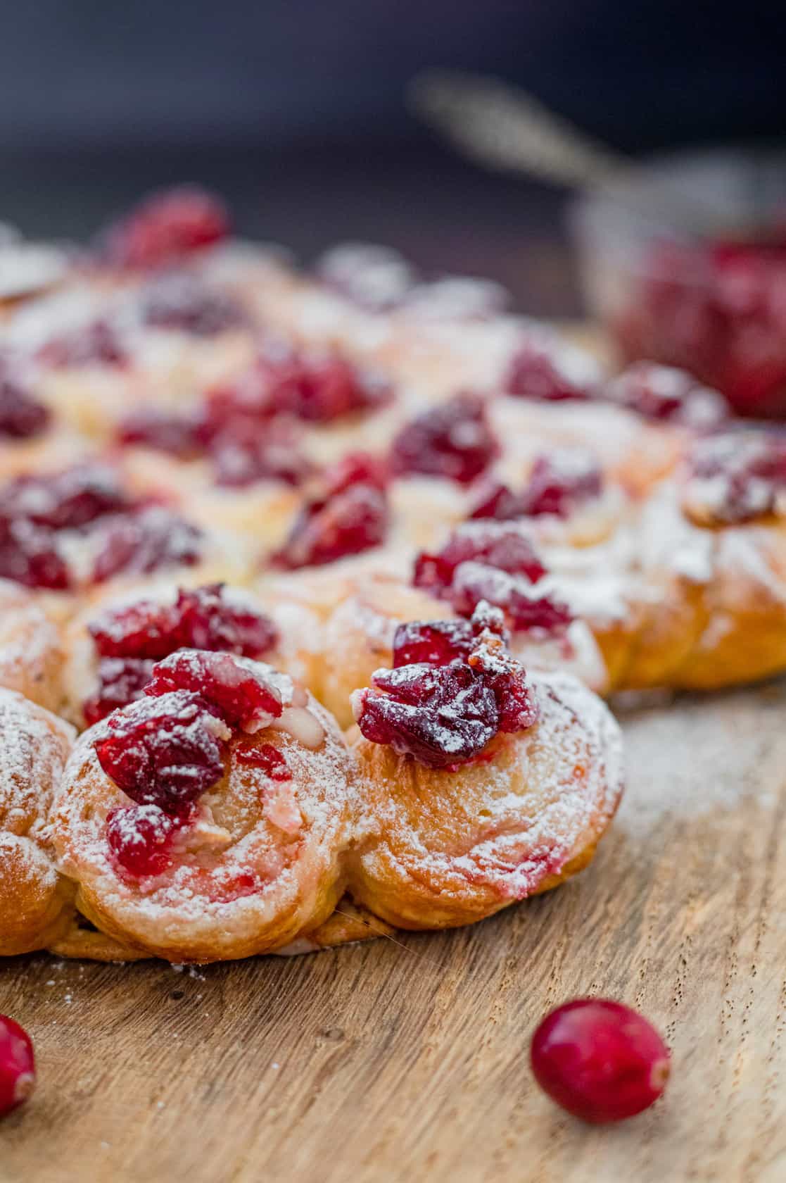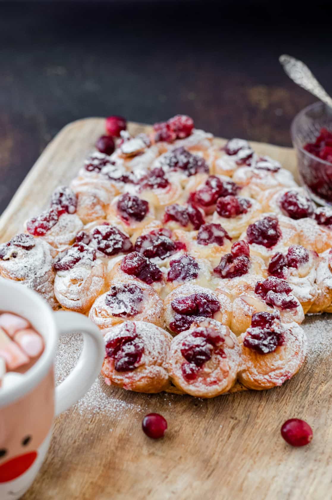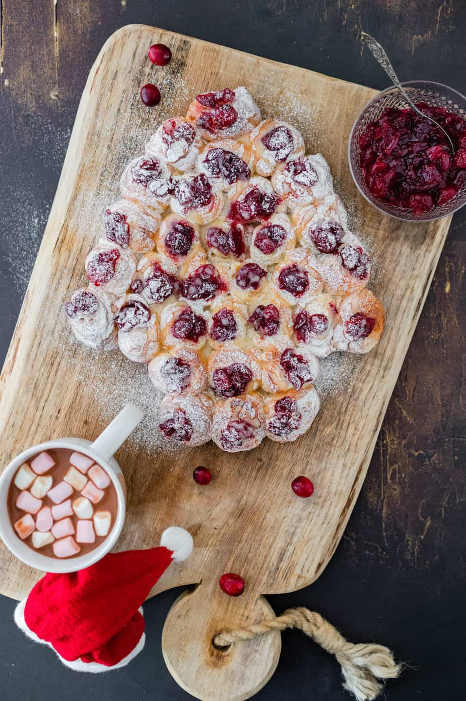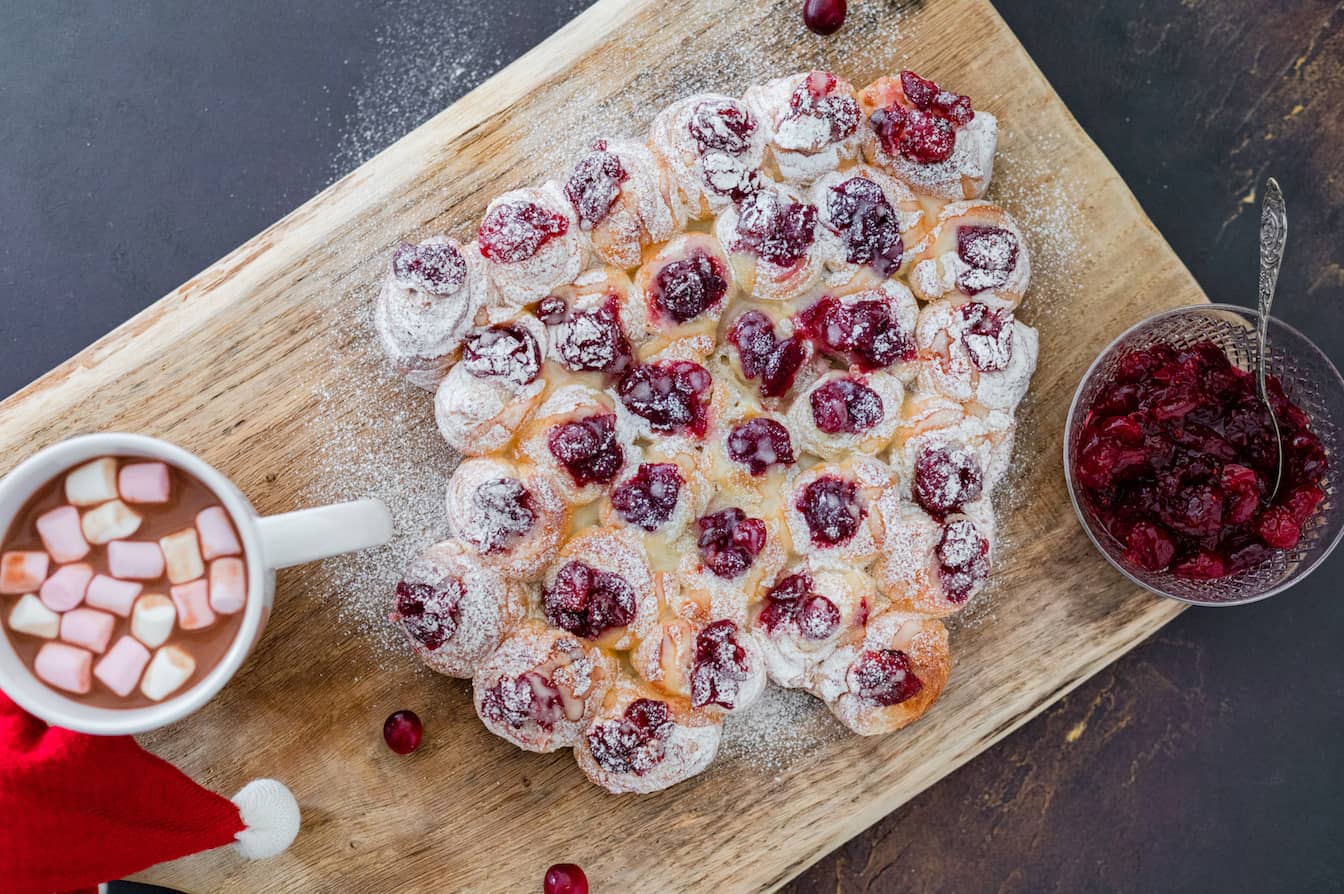 Voor het kerstontbijt maak ik altijd graag één gerecht wat er enorm spectaculair uitziet en net zo smaakt. En ook dit jaar is het weer geluk met deze ontbijt kerstboom met cranberry en chocolade. Als basis hebben we kant-en-klaar deeg voor pain au chocolat gebruikt en daar hebben we zelfgemaakte cranberry-sinaasappelvulling, mascarpone en glazuur aan toegevoegd. Een echte zoete kersttraktatie voor het kerstontbijt of de -brunch!