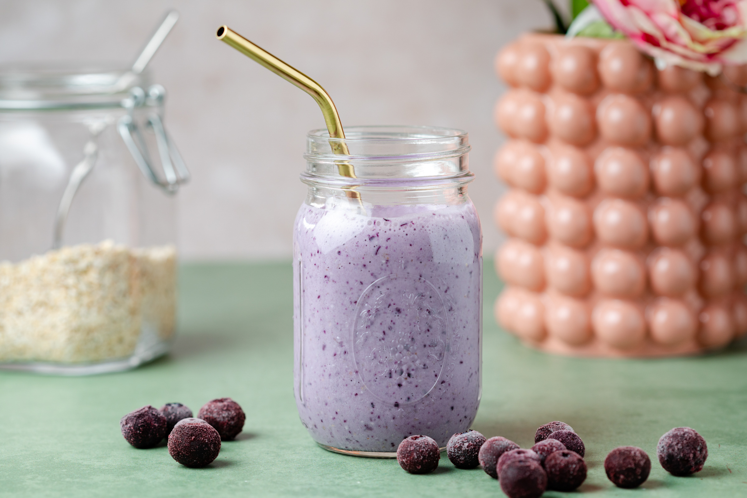 - Schenk 200 ml kokosdrank in een hoge maatbeker en voeg de 30 gr eiwitpoeder, 30 gr havermout en 75 gr blauwe bessen toe. Schenk kokosdrank bij tot de ingrediënten net onder staan.